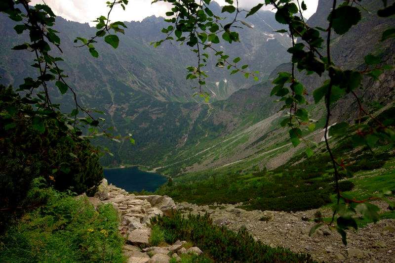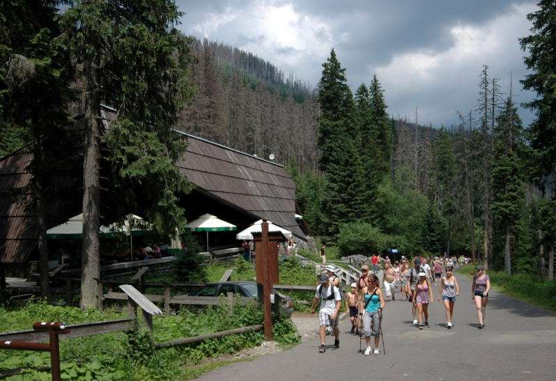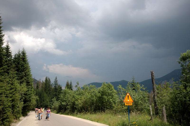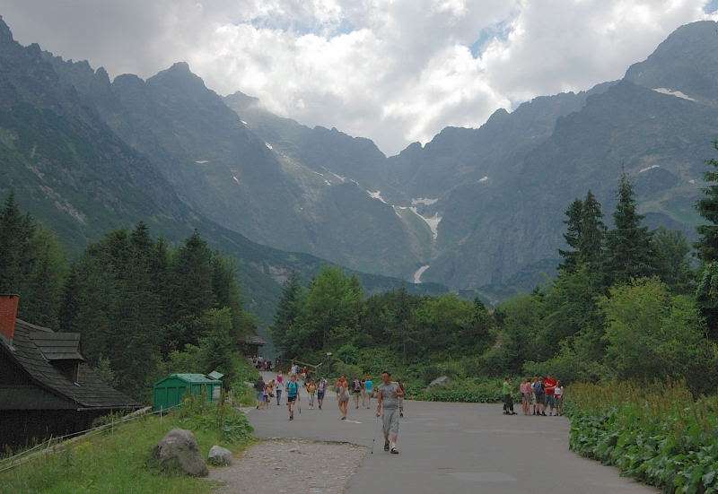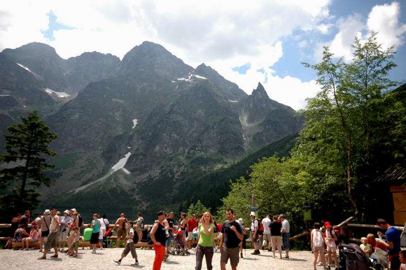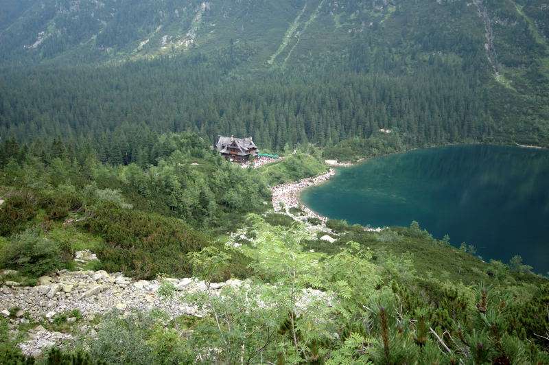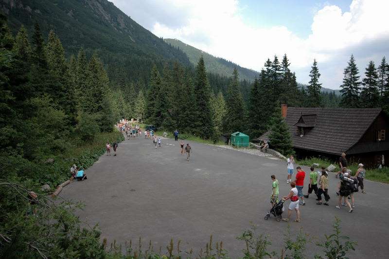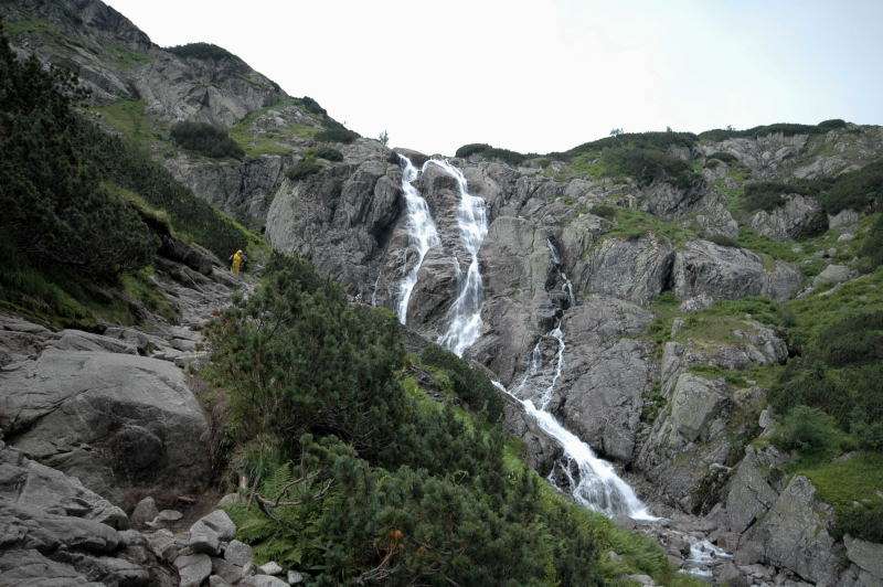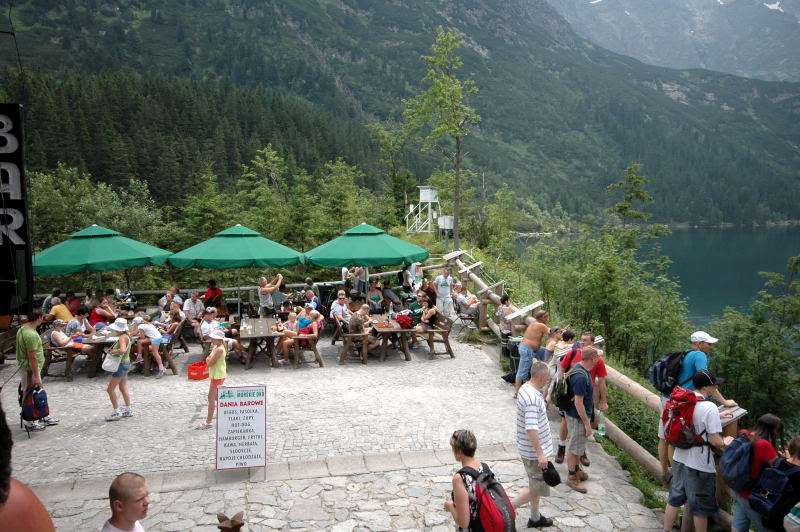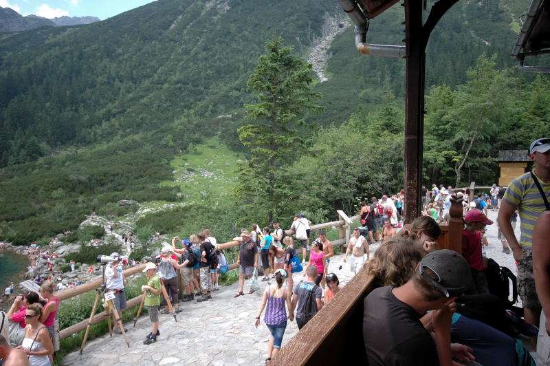Od strony Tatr Bielskich nadciągała burza i to zdecydowało o tym, że nie wchodziłem już na szczyt Szpiglasowego Wierchu tylko szlakiem zółtym podążyłem w stronę Morskiego Oka. Oczywiście po drodze mijałem wielu „niedzielnych” klapkowiczów podążających w przeciwną stronę, wielu z nich zdziwonych że ja już schodzę. Zszedłem do Moka – a jakże – ale wybaczcie że nie opiszę Wam jak smakował żurek w najpopularniejszej knajpie w Tatrach bo Grunwald i Oblężenie Malborka przy tym to pikuś (przepraszam Pana Pikusia). Z przerażeniem w oczach i brakiem woli walki o przejście i miejsca w osobnych kolejkach, machnąłem tylko kilka fotek i pospiesznie ruszyłem ceprostradą w dół Doliny Rybiego Potoku. Idąc pospiesznie miałem wciąż przed oczami nadciągające chmury, błyski i grzmoty ale tłum napierający z dołu, roznegliżowany przynajmniej do połowy nic sobie z tego nie robił. Dotarłem do Wodogrzmotów i stwierdziłem, że bezpiecznie będzie to przeczekać w Starej Roztoce, tym bardziej że czekał tam na mnie kolejny żurek.