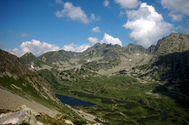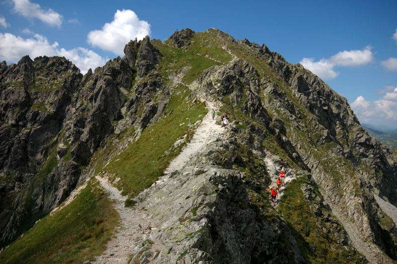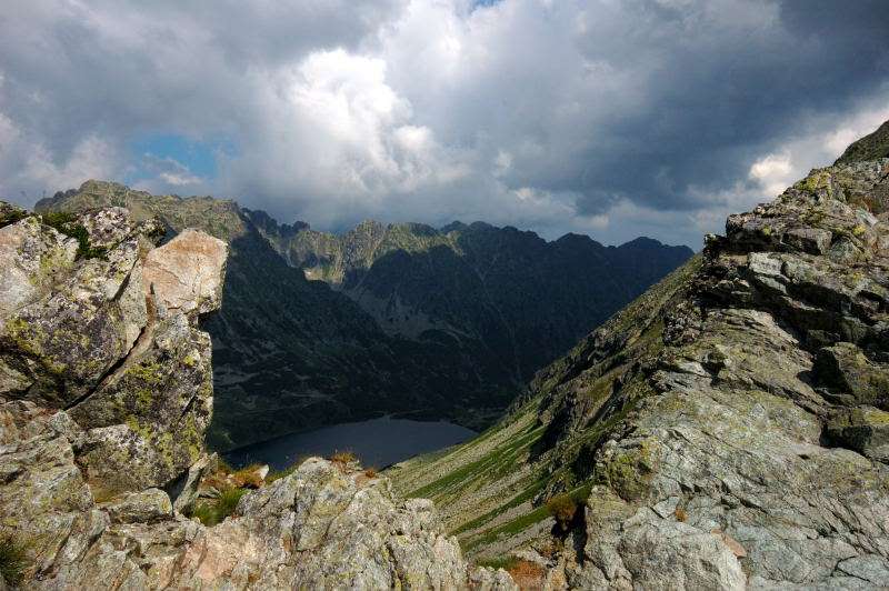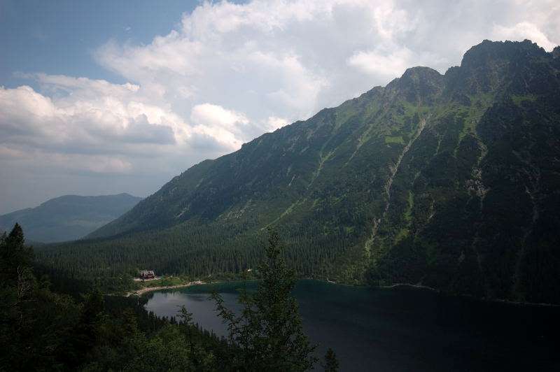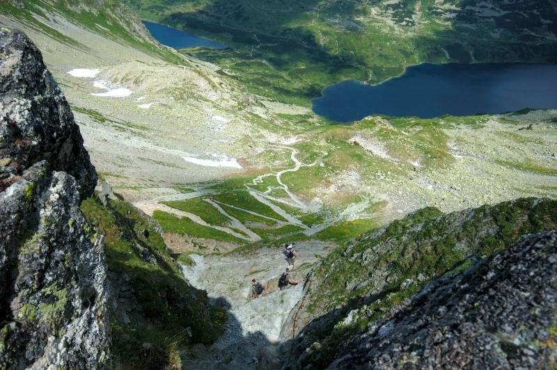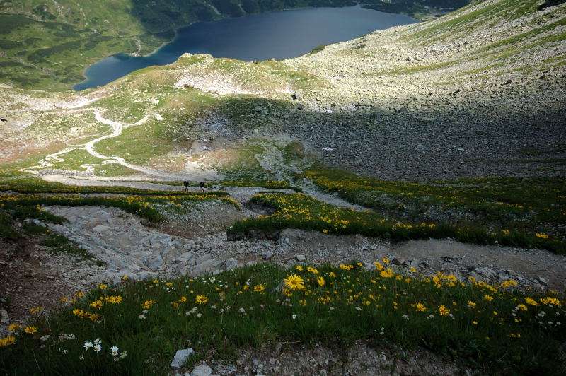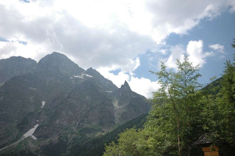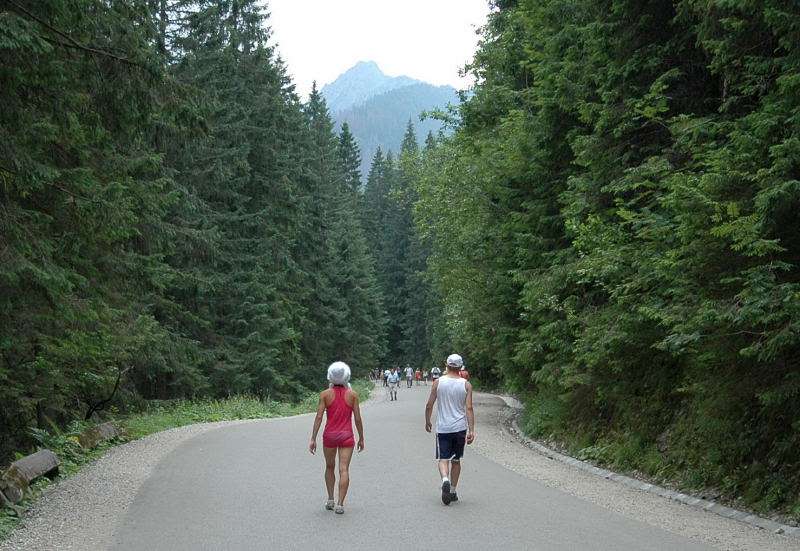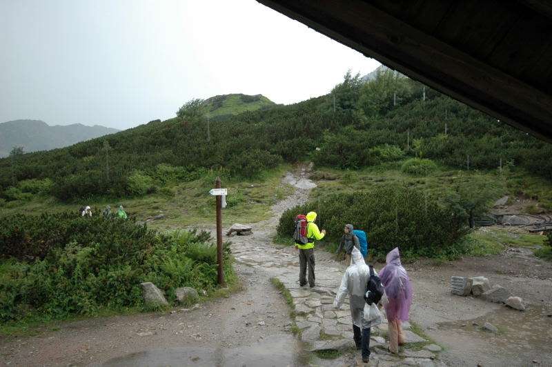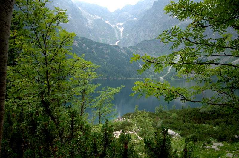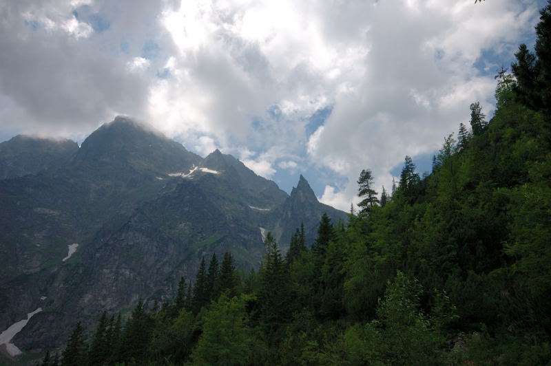 Od strony Tatr Bielskich nadciągała burza i to zdecydowało o tym, że nie wchodziłem już na szczyt Szpiglasowego Wierchu tylko szlakiem zółtym podążyłem w stronę Morskiego Oka. Oczywiście po drodze mijałem wielu „niedzielnych” klapkowiczów podążających w przeciwną stronę, wielu z nich zdziwonych że ja już schodzę. Zszedłem do Moka – a jakże – ale wybaczcie że nie opiszę Wam jak smakował żurek w najpopularniejszej knajpie w Tatrach bo Grunwald i Oblężenie Malborka przy tym to pikuś (przepraszam Pana Pikusia). Z przerażeniem w oczach i brakiem woli walki o przejście i miejsca w osobnych kolejkach, machnąłem tylko kilka fotek i pospiesznie ruszyłem ceprostradą w dół Doliny Rybiego Potoku. Idąc pospiesznie miałem wciąż przed oczami nadciągające chmury, błyski i grzmoty ale tłum napierający z dołu, roznegliżowany przynajmniej do połowy nic sobie z tego nie robił. Dotarłem do Wodogrzmotów i stwierdziłem, że bezpiecznie będzie to przeczekać w Starej Roztoce, tym bardziej że czekał tam na mnie kolejny żurek.