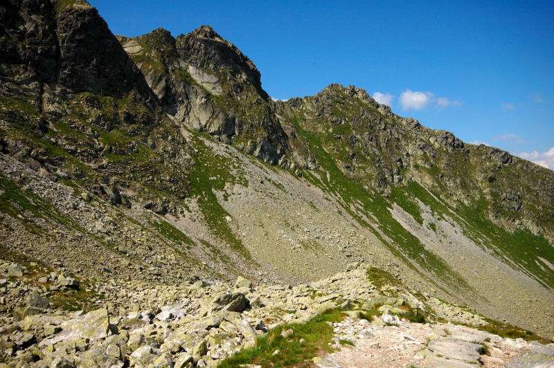 Słowacy wstali najwcześniej (znaleźli zwłoki) i to w zasadzie oni zbudzili mnie dzwonieniem „szpejów”. Czyste niebo nie zapowiadało załamania pogody więc plan był prosty: zrobić pętlę i zjeść żurek w Moku i Starej Roztoce. Powoli spakowałem sprzęt i zawiesiłem plecak na wieszaku przy ekranie pogodowym w korytarzu, a że kuchnia jeszcze była zamknięta a do łazienki długa kolejka poszedłem zmoczyć twarz do stawu. Zmoczyć, a nie kąpać się – jak to ktoś przede mną zrobił zostawiając po sobie kłęby pływającej piany z jakiegoś chemicznego badziewia. Dziewczyny otworzyły okienko i ja także, jak wiele osób na jadalni, podążyłem z kubkiem po wrzątek – no bo bez kawy się nie ruszam. Z dołu, od Roztoki zaczęli przychodzić pierwsi turyści więc stwierdziłem, że czas się ewakuować z nadciągającego mrowiska. Nie brałem ze sobą plecaka więc wziąłem tylko niezbędne rzeczy i ruszyłem w stronę Szpiglasowej Przełęczy. Po odbiciu na żółty szlak, przy pierwszym strumieniu zatrzymałem się na dłuższą chwilę bo cisza i magia tego miejsca były niesamowite. Zdjąłem buty, chodziłem po gorącym mokrym mchu i cieszyłem się jak niemowlak. Stopy zapadały się, a woda wypływała i zakrywała stopy… Cudowne uczucie. W oddali słychać było odgłosy nadchodzących ludzi od strony przełęczy więc czas był i na mnie. Chwilę jednak szedłem po gładkich kamieniach niosąc buty w rękach bo to jest zbyt przyjemne. Miałem pewien cel więc po dojściu do ścieżki z ostrym piaskiem założylem buty i ruszyłem ostro do przodu. Podejście i łańcuchy bez obciążenia plecakiem okazały się tym razem drobiazgiem i po około 95 minutach od wyjścia ze schroniska, stałem na przełęczy.