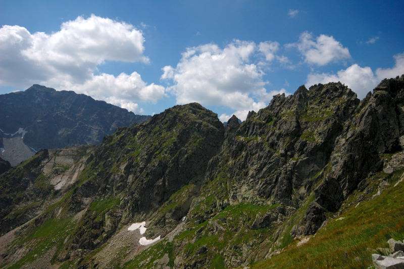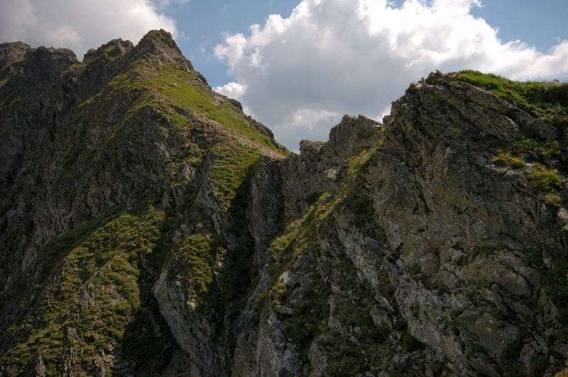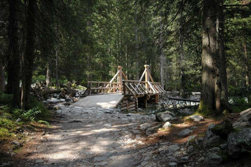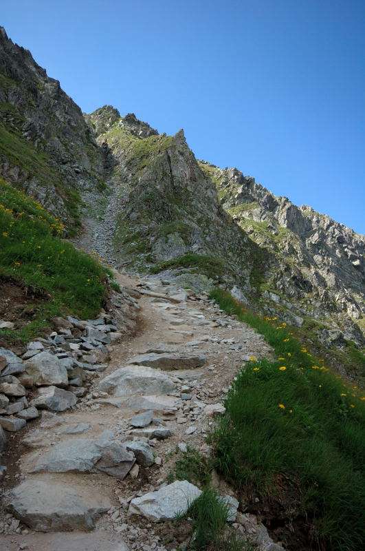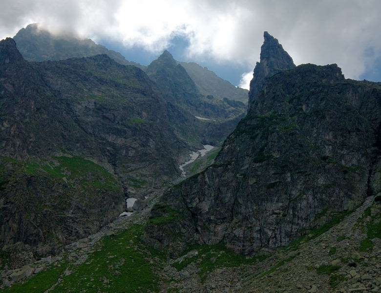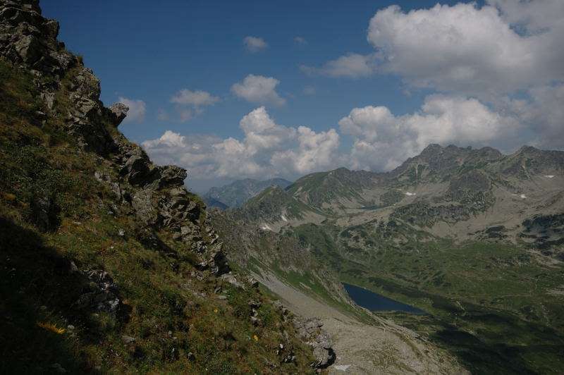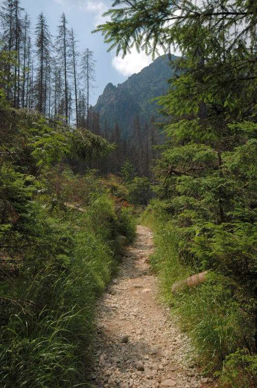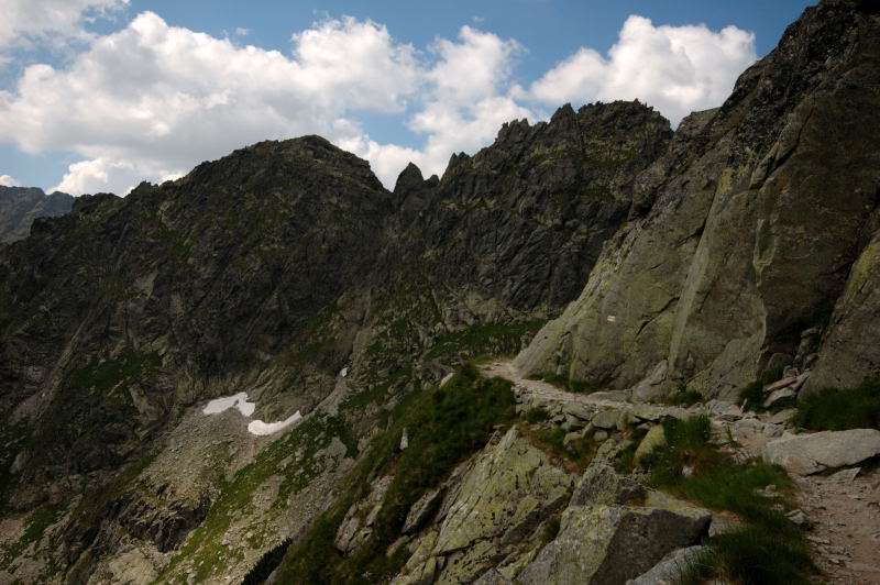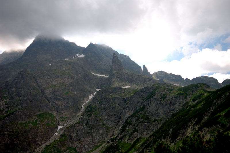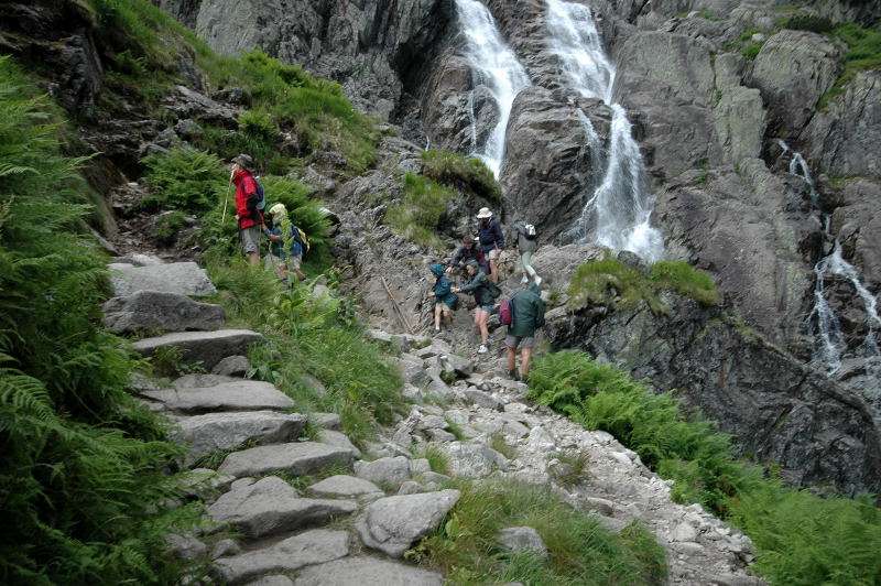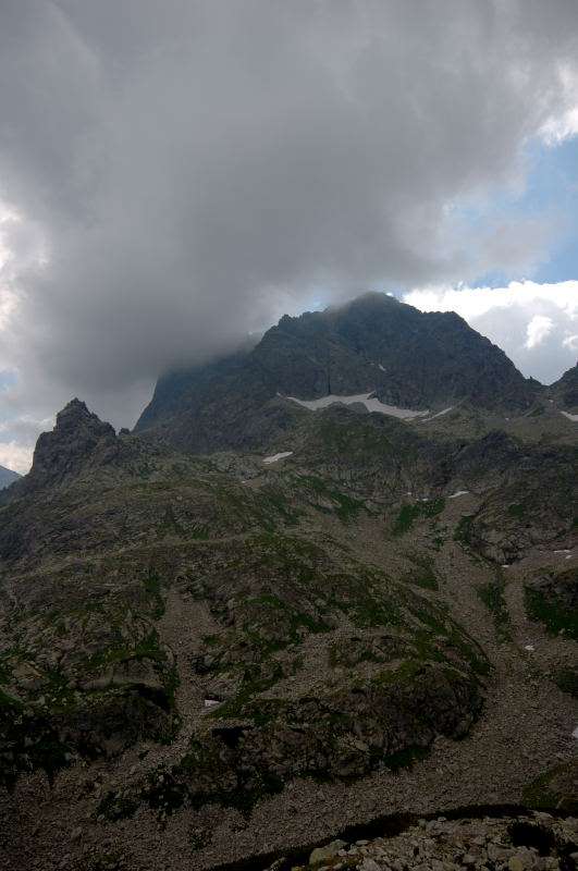 Burza kłębiła sięnad Tatrami Bielskimi i powoli przenosiła się nad rejon Rysów więc zaryzykowałem i ruszyłem Roztoką do „Piątki”. Przechodząc ponownie obok Wodogrzmotów, wpadłem we wciąż napierający do góry tłum, który jakby ślepy i głuchy nie widział co nad nimi i przed nimi się szykuje. Na trasie Roztoki było jeszcze dosyć tłumnie ale zdecydowaną większość stanowiły osoby schodzące. Dosyć szybko minęła mi trasa i dotarłem do dolnej platformy wyciągu technicznego schroniska. Tu popełniłem błąd bo ruszyłem w stronę Śiklawy zamiast szybszym szlakiem czarnym do schroniska.
