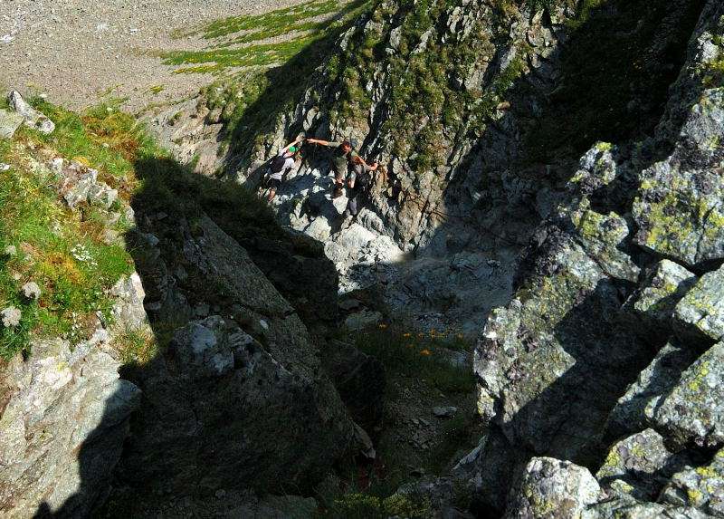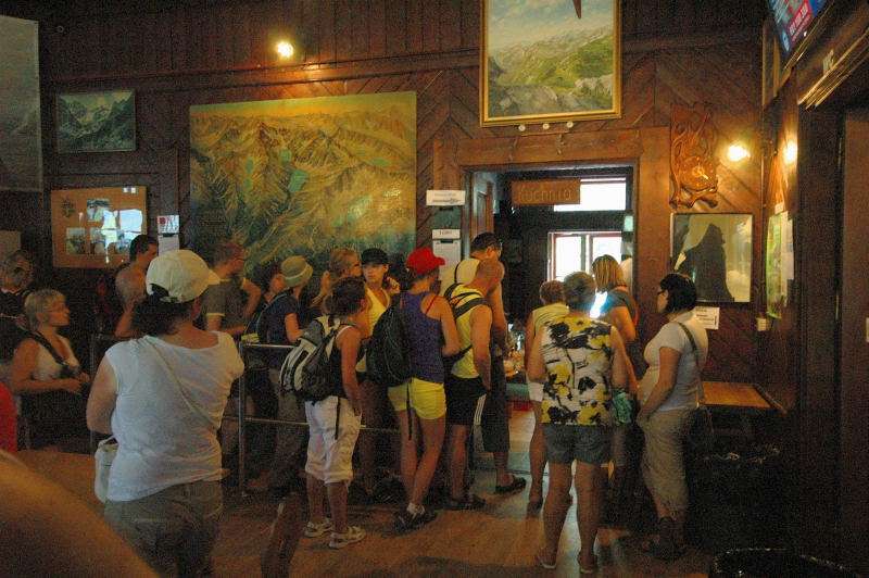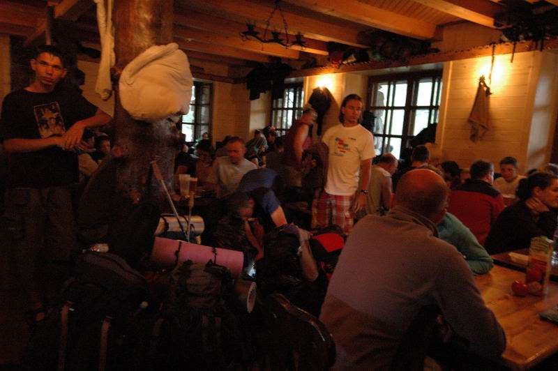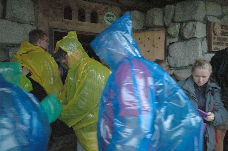 Po ok. pół godzinie istnego szaleństwa na niebie, burza nieco zelżała i stwierdziłem że bardziej mokry już i tak nie będę więc nie ma co czekać na ciepłą wodę i masaż więc ruszyłem do schroniska. Ruszyłem i doszedłem ale to nie znaczy że wszedłem… Już przed budynkiem, pod dachem, na każdy metr przypadało ze 4 osoby, a w środku zagęszczenie było 2 razy większe. Dopchałem się do swojego plecaka w korytarzu i najprzyjemniejszą chwilą było zdjęcie butów i założenie sandałów. Po kolejnych 20 minutach stałem się szczęśliwym posiadaczem 2 zielonych, aluminiowych puszek i dołączyłem do obserwatorów tarasowych. Od tego momentu jakikolwiek ton żartu byłby juz nie na miejscu bo na grani Orlej Perci a dokładnie w rejonie Zamarłej Turni rozgrywały się tragedie. Piszę tragedie bo dotyczyło to większej grupy ludzi. Pisząc to wiem o 2 ofiarach i 4 rannych w tym 2 poważnie ale jak to w górach bywa, o kolejnych możemy dowiedzieć się znacznie później przypadkiem lub wcale bo są rejony gdzie nikt nie dociera i nie wiadomo co tam leży.