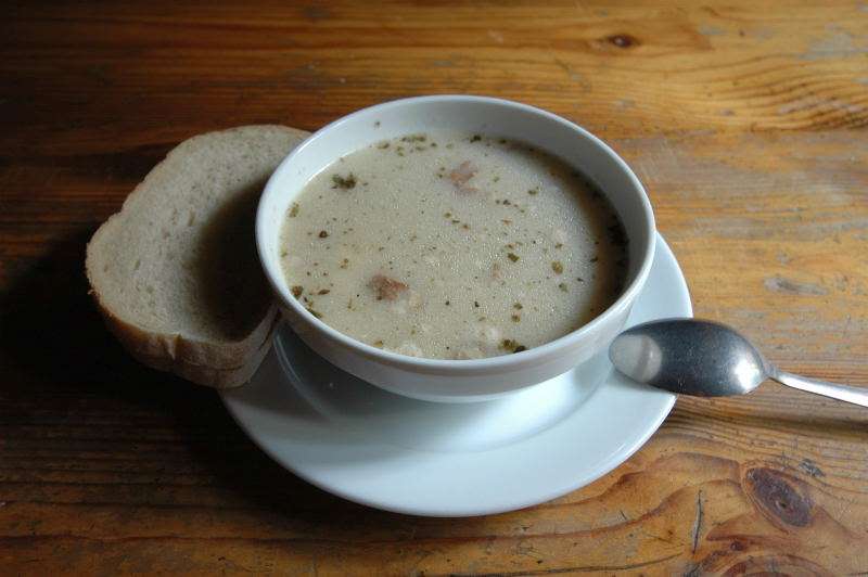 Najlepszy żurek w Tatrach: dwie zgrabne połóweczki jajka, sporo wędliny i dobrze przyprawiony. 7 zł. z pieczywem