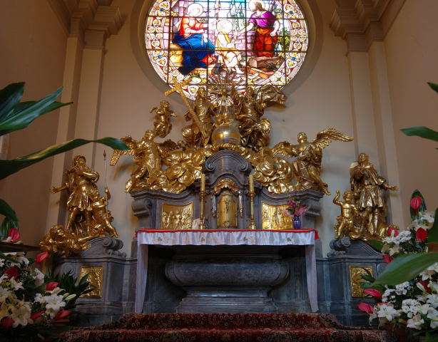 Skarbiec Jakubowy w dzwonnicy. Imponujący zbiór arcydzieł sakralnego złotnictwa nyskich mistrzów w futurystycznej oprawie; stalowo – szklanej konstrukcji skarbca.