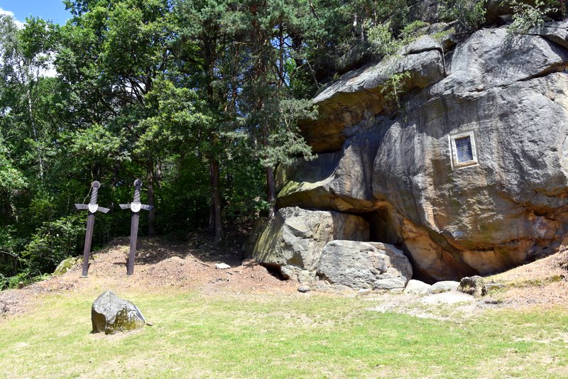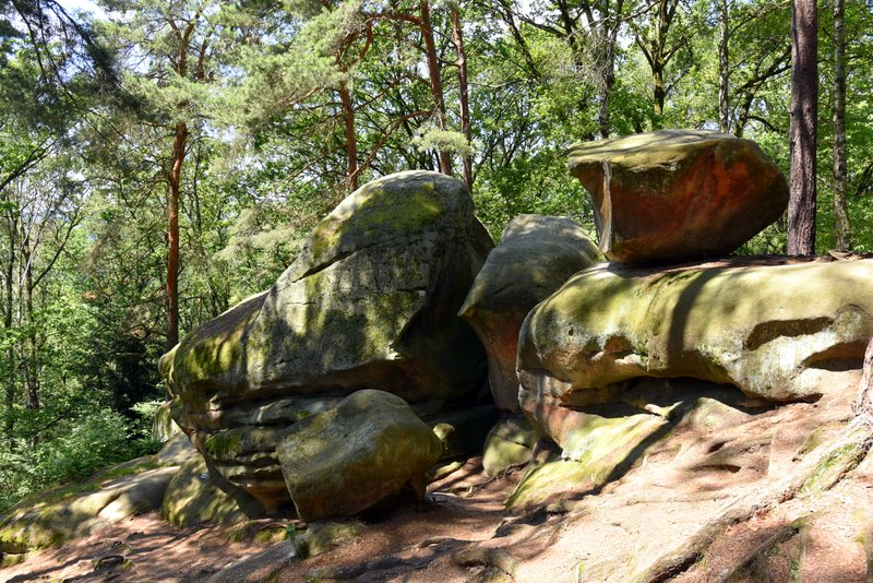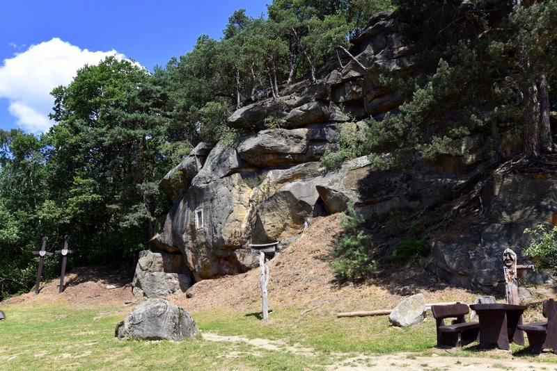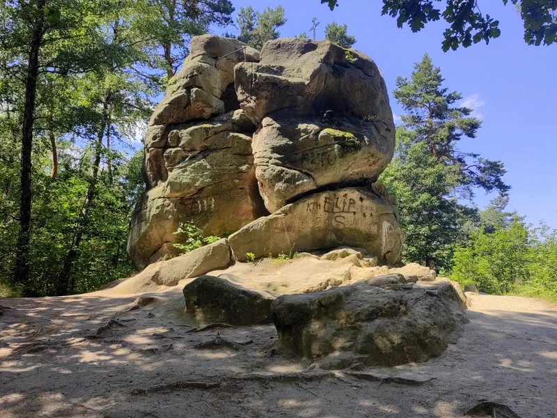 Największą i najbardziej okazałą wychodnią „Skamieniałego Miasta” jest „Grunwald”. Pierwotną nazwę „Piekło” wychodnia ta zawdzięcza „Tajemniczej Szczelinie”, gdzie według legendy raz w roku pojawiać się mają ogromne skarby. Obecna nazwa nadana została w 500 rocznicę bitwy z pod Grunwaldem. Tablicę pamiątkową, wykutą w skale w 1910 r. ufundował I.J.Paderewski. Wchodząc do rezerwatu mijamy źródło „zdrowej wody”, o którym tak zwykł mawiać wielki muzyk i patriota (Pulit F., 1993). Szlak prowadzi wyłożoną kamieniem drogą do jedynego miejsca w rezerwacie, gdzie istnieje możliwość rozpalenia ogniska. Trochę dalej dochodzimy do Warowni Dolnej i Górnej. Na tej drugiej odnaleźć możemy XIX – wieczne inskrypcje eksplorujących ten teren. Krótkim szlakiem dość możemy do jaskiń w powstałym na potrzeby budowy linii kolejowej kamieniołomie. Dalej wyobraźnia podpowiada nam nazwy kolejnych skał. Rozpoznajemy bez problemu skały „Orzeł”, „Pianino”, „Pieczarki”, „Żółw”, „Piekiełko” i „Borsuk”. Napotykamy dalej kolejno niewielkie „Baranki” i ostro zakończone „Piramidy” – oberwane fragmenty większej skały zamykającej „Lisi Wąwóz”. Na wychodni ograniczającej „Lisi Wąwóz” odnajdziemy korzeń o wygiętym kształcie przypominający formą „Aligatora”. Mijamy stojącą samotnie „Pustelnię” i dochodzimy do „Baszty Paderewskiego”. Nazwa została nadana wysokiej ambonie w 1985 r., w 125 rocznicę urodzin artysty. Tutaj Tarnowskie Towarzystwo Muzyczne wmurowało tablicę upamiętniającą pamięć wielkiego polityka i pianisty. Przechodzimy obok „Cyganki” i „Grzybka” i dochodzimy do polany z której ukazuje się nam widok w kierunku południowym, na Zborowice w Dolinie Białej, Góry Grybowskie – najbardziej na zachód wysuniętej Beskidu Niskiego i Beskid Sądecki. Dochodzimy do ostatniej na naszej trasie wychodni „Skałki z krzyżem”, na którą wejść można poprzez wąską, ciasną szczelinę. Z góry roztacza się panorama na Ciężkowice i Dolinę Białej, a w głębi najbardziej na północ wysuniętą część Pogórza Rożnowskiego, Pasmo Wału i Lubinki.