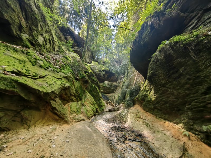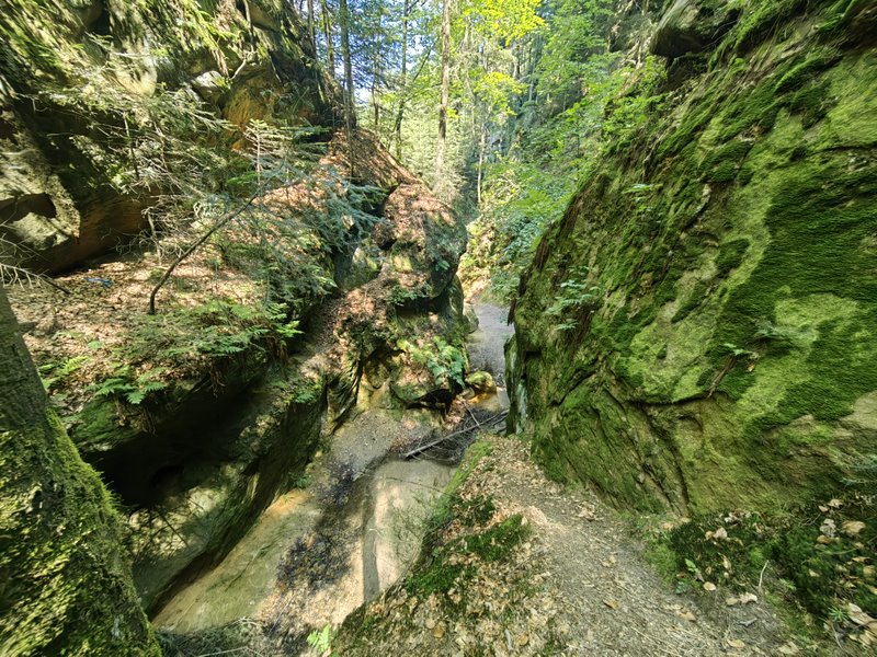 Idąc dalej szlakiem niebieskim biegnącym w kierunku Rzepiennika Strzyżewskiego dochodzimy do pomnika przyrody nieożywionej – Jar „Wodospad”. Zaliczany do największych atrakcji turystycznych okolic Ciężkowic, leży już poza rezerwatem „Skamieniałe Miasto”. Schodząc szlakiem w dolinę, po przejściu przez mostek, należy odbić w prawo i przejść kilkanaście metrów pośród skał. Popularnie nazywany „Wąwozem Czarownic”, przybiera postać głębokiej rozpadliny skalnej długiej na ponad 40 metrów i szerokiej do 4 metrów. Ograniczają go kilkunastometrowe ściany skalne z piaskowca ciężkowickiego, często w postaci nadwieszonych ambon. Wąwóz zakończony jest przewieszoną ścianą o wysokości 14 metrów, z której spływa potok tworząc wodospad. W okresie wczesnowiosennym powstaje dużych rozmiarów efektowny lodospad. Na terenie rezerwatu stwierdzono występowanie trzech zespołów leśnych. Są to: kontynentalny bór mieszany jest zbiorowiskiem lasu sosnowo – dębowego stosunkowo ubogiego florystycznie, podgórska dąbrowa acydofilna i jodłowy bór mieszany. Występowanie wielu drzewostanów leśnych na terenie stosunkowo niewielkiej powierzchni stanowi o znacznej różnorodności florystycznej i fitosocjologicznej. Takie zróżnicowanie spowodowane jest różnorodnością warunków glebowych, a w efekcie znaczne zróżnicowanie gatunków roślin. Na obszarze rezerwatu stwierdzono występowanie 124 gatunków roślin naczyniowych (bez mchów, wątrobowców i porostów). Spośród nich, 16 gatunków objętych jest ochroną prawną (ZPKPwT, 2006). Ze względu na niewielką powierzchnię, znikomo wykształcone piętro podszytu oraz znaczną penetrację terenu przez turystów, wśród zamieszkujących rezerwat zwierząt brakuje gatunków zwierząt o dużych rozmiarach. Bogaty jest natomiast świat owadów i ptaków. Wśród bezkręgowców na uwagę zasługują barwne motyle, trzmiele, chrząszcze. Na terenie rezerwatu bardzo często obserwować można mrówki z rodzaju gmachówka. Występują w bardzo dużej ilości na skale „Ratusz”.