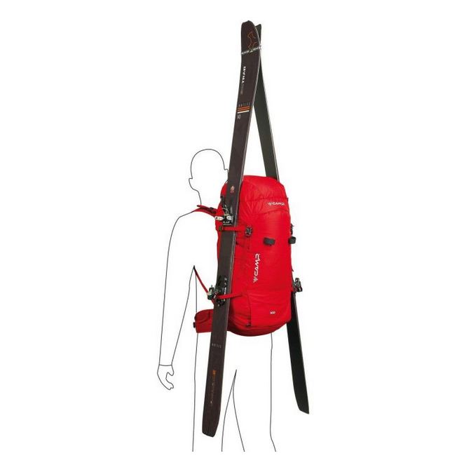 Plecak posiada odpinaną klapę z 2 kieszeniami oraz wewnętrzne zamykanie w postaci kołnierza zamykanego ściągaczem. Dodatkowo plecak posiada 2 wewnętrzne elastyczne kieszenie na suwak, uchwyty na czekany i kije trekkingowe, mocowanie nart A-Frame, które można wykorzystać także do mocowania deski snowboardowej lub innych akcesoriów oraz zewnętrzny system do przenoszenia kasku.