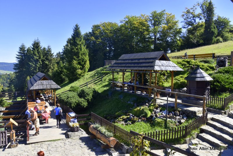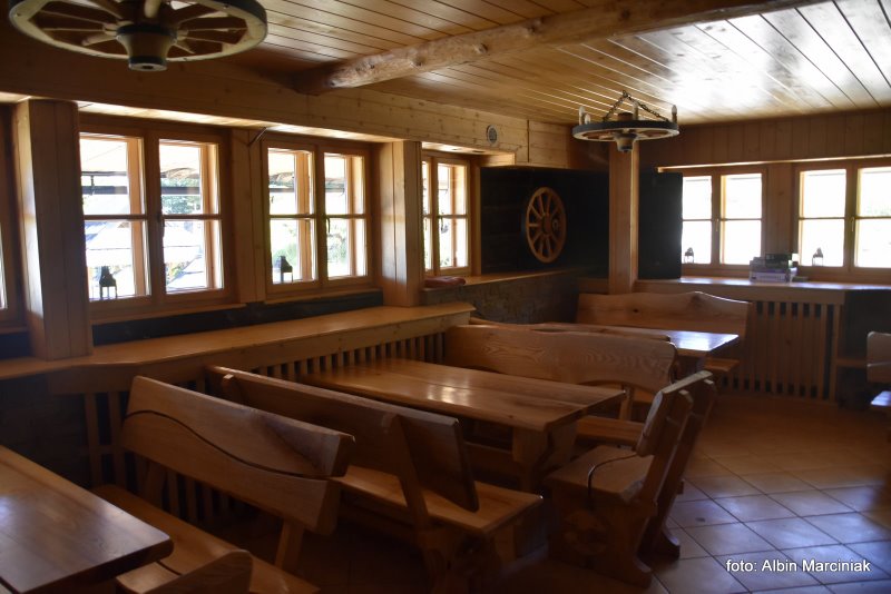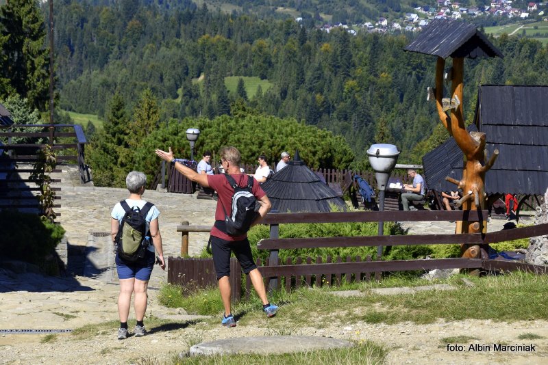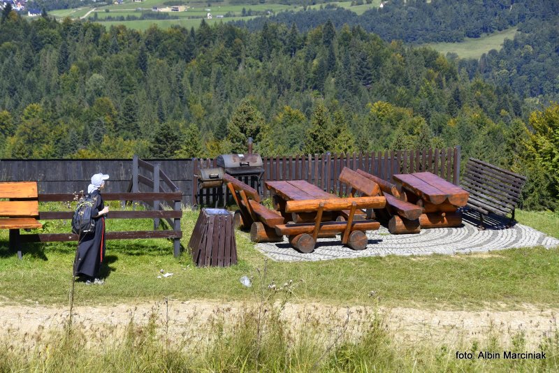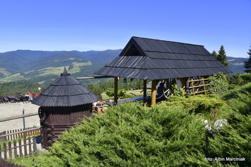 Na tarasie są miejsca do wypoczynku i relaksu z widokiem na Pieniny, Gorce i Beskid Sądecki.