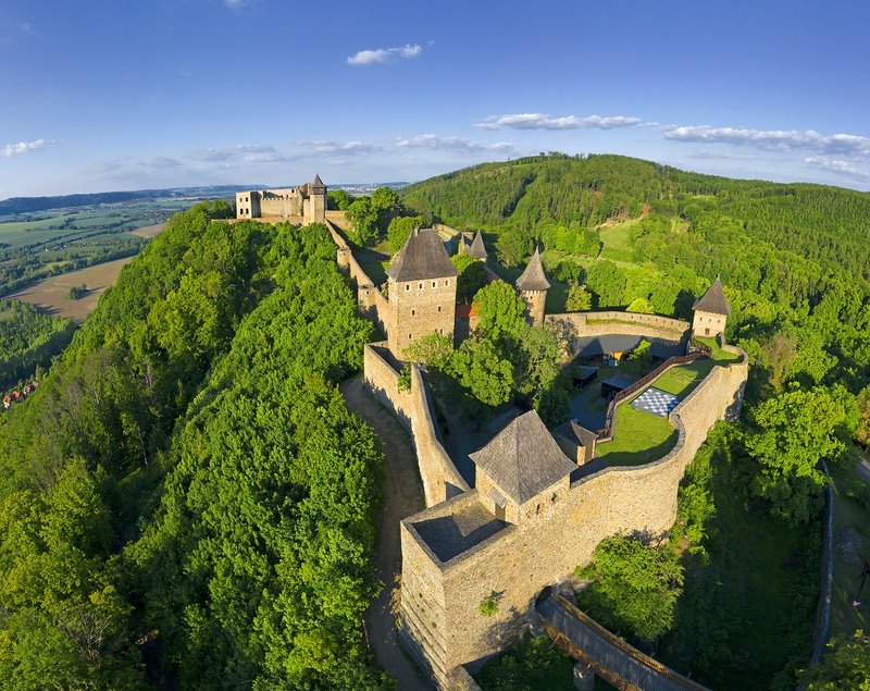 Średniowieczny zamek Bouzov , położony niedaleko Ołomuńca, oferuje kilka tras prezentujących pomieszczenia reprezentacyjne i mieszkalne, elementy fortyfikacji i zaplecze techniczne, na przykład zabytkowe instalacje grzewcze i wodne.