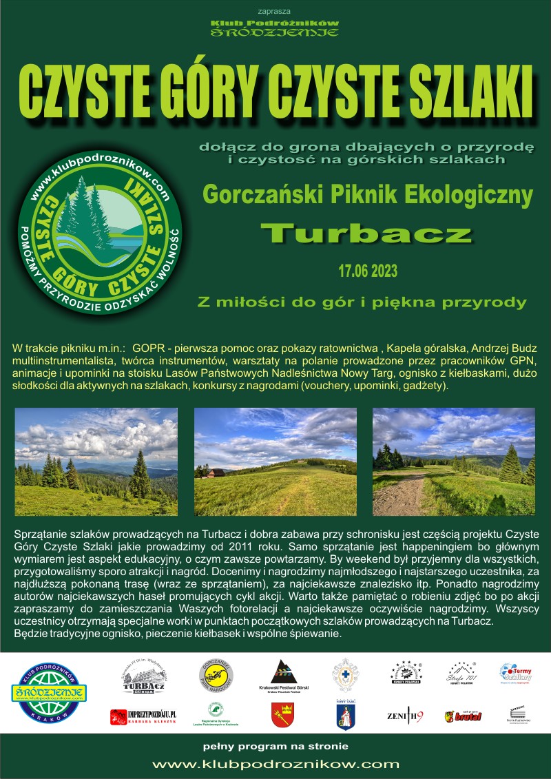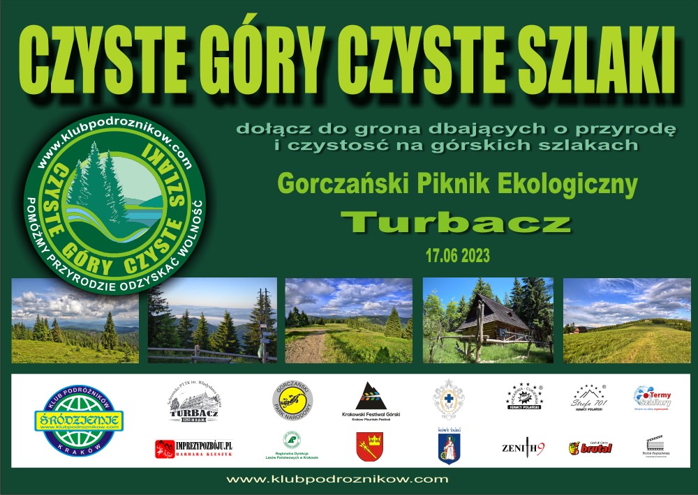 Sprzątanie szlaków prowadzących na Turbacz i dobra zabawa przy schronisku jest częścią projektu Czyste Góry Czyste Szlaki jakie prowadzimy od 2011 roku. Samo sprzątanie jest happeningiem bo głównym wymiarem jest aspekt edukacyjny, o czym zawsze powtarzamy. By weekend był przyjemny dla wszystkich, przygotowaliśmy sporo atrakcji i nagród. Docenimy i nagrodzimy najmłodszego i najstarszego uczestnika, za najdłuższą pokonaną trasę (wraz ze sprzątaniem), za najciekawsze znalezisko itp. Ponadto nagrodzimy autorów najciekawszych haseł promujących cykl akcji. Warto także pamiętać o robieniu zdjęć bo po akcji zapraszamy do zamieszczania Waszych fotorelacji a najciekawsze oczywiście nagrodzimy. Wszyscy uczestnicy otrzymają specjalne worki w punktach początkowych szlaków prowadzących na Turbacz.