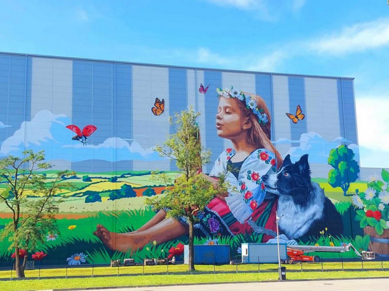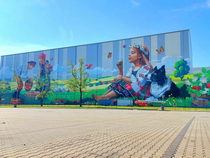 Ogromny kolorowy obraz powstał na budynku magazynowym zakładu Agros Nova (Grupa Maspex). Prace trwały także w ostatni weekend sierpnia a efekt jest rewelacyjny. Kolory oraz stroje nawiązują do Łowickich tradycji, natomiast tematyka oczywiście do profilu firmy.
