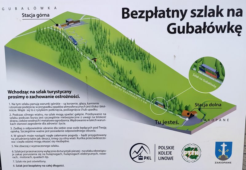 Mimo iż sytuacja z prawem własności i przebiegiem szlaku została już prawnie rozwiązana, to na wybierających pieszą wędrówkę na Gubałówkę czeka niespodzianka. Nadal stoi tablica informująca o wejściu na teren prywatny oraz o kasie i płatności za przejście tym odcinkiem. Nie należy się jednak tym przejmować a na turystów nie czeka żadna niespodzianka z opłatami.