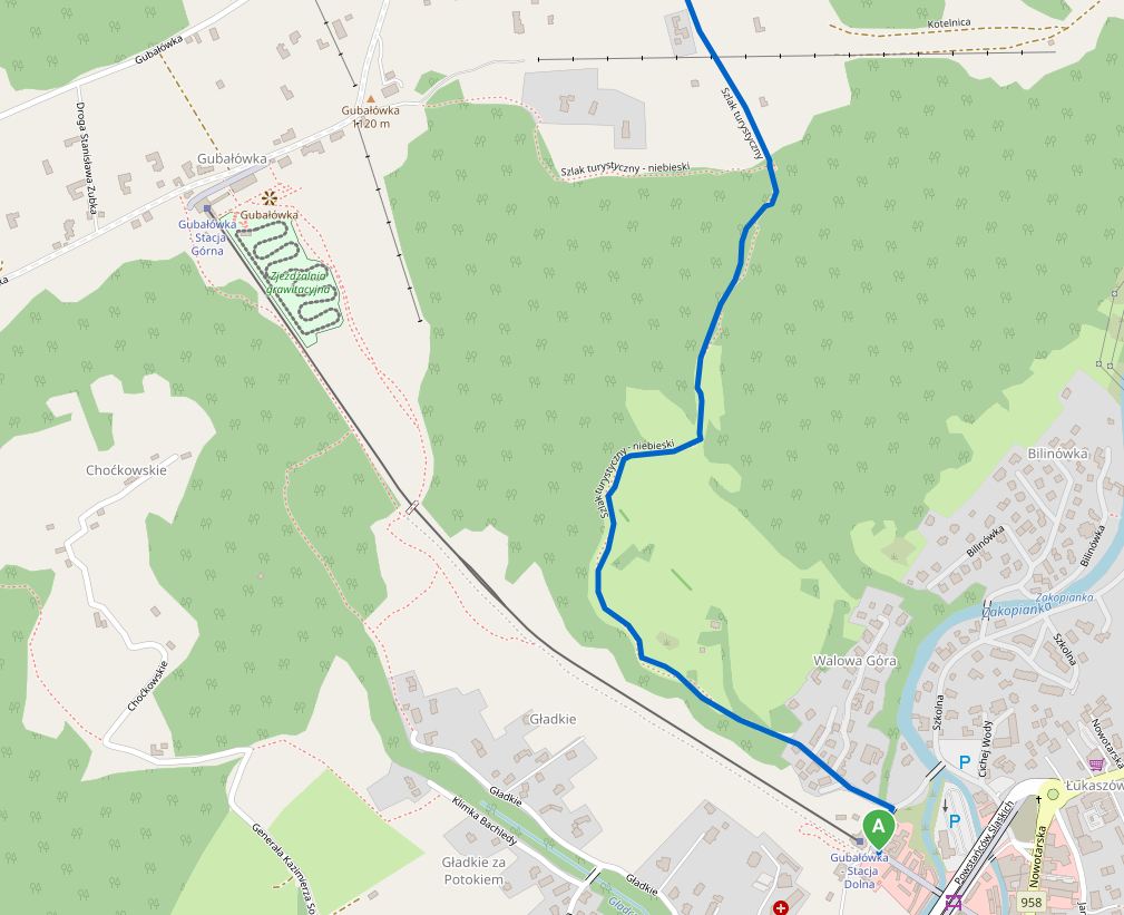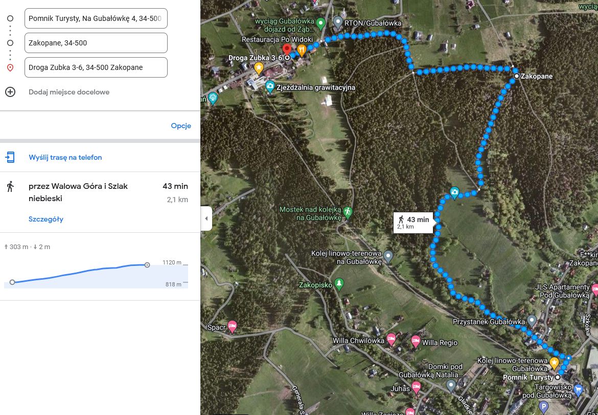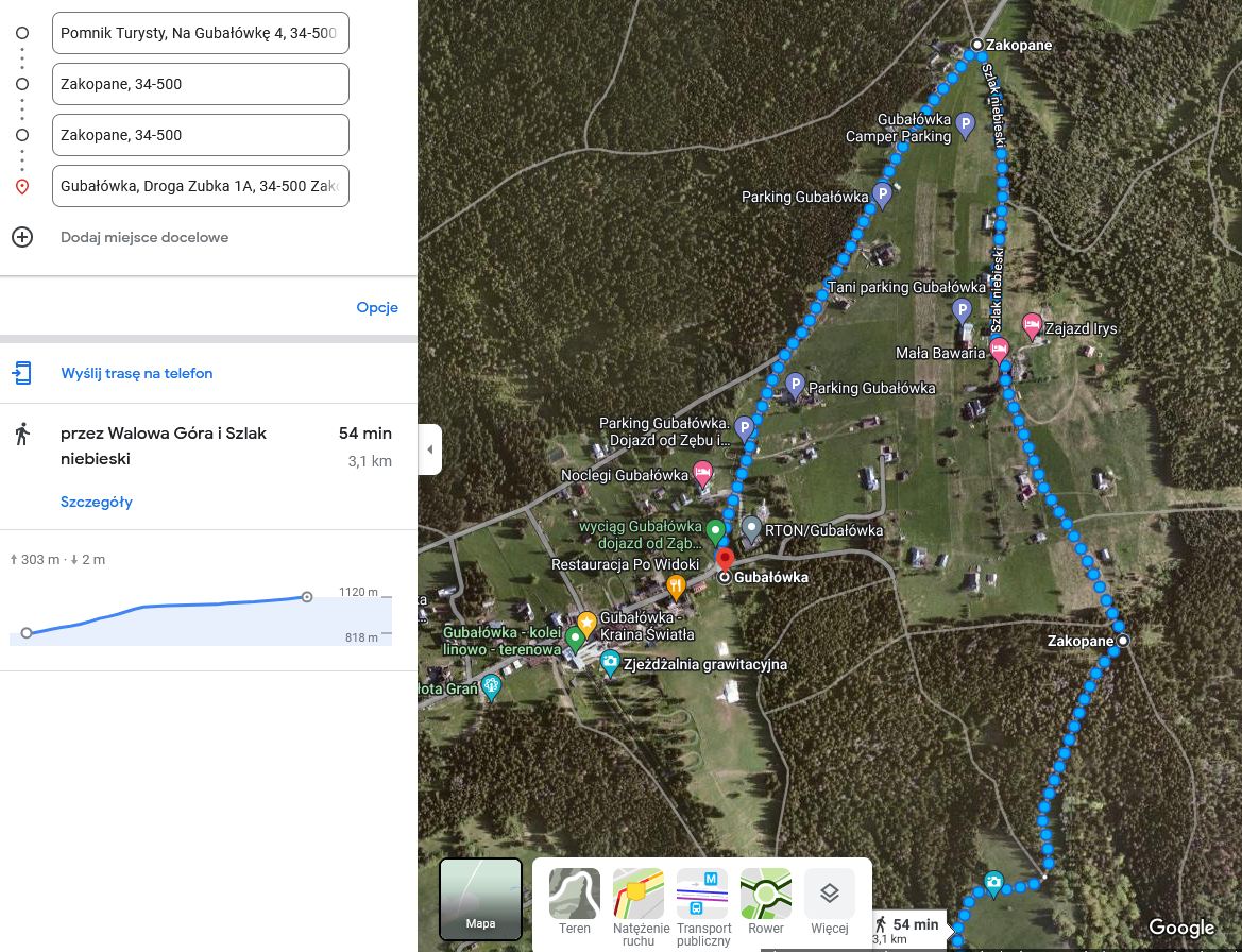 Szlak niebieski rozpoczyna się przy dolnej stacji kolejki PKL na Gubałówkę z prawej strony budynku. Po przejściu ok 1300 metrów jest widoczne odbicie w lewo od szlaku głównego. Ścieżka biegnie na skraju lasu i dochodzi do Drogi Zubka, która jest główną arterią przy której ulokowane są główne atrakcje na Gubałówce. Ta wersja to 2 km przy ok 300 m podejścia.