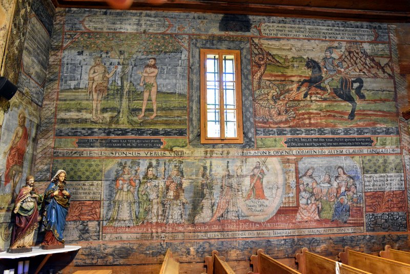 Wystrój wewnętrzny kościoła nosi wyraźne cechy okresu reformacji, kiedy kościół przez krótki czas był świątynią ewangelicką. Z tego okresu, a konkretnie z 1665 roku, pochodzą malowidła na południowej ścianie nawy. Przedstawiają one sceny biblijne: Adama i Ewę pod drzewem wiadomości dobrego i złego, przypowieść o pannach roztropnych i nierozsądnych oraz św. Jerzego walczącego ze smokiem Ich funkcję wychowawczą podkreślają cytaty z Biblii po łacinie oraz w języku staroczeskim.