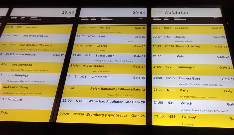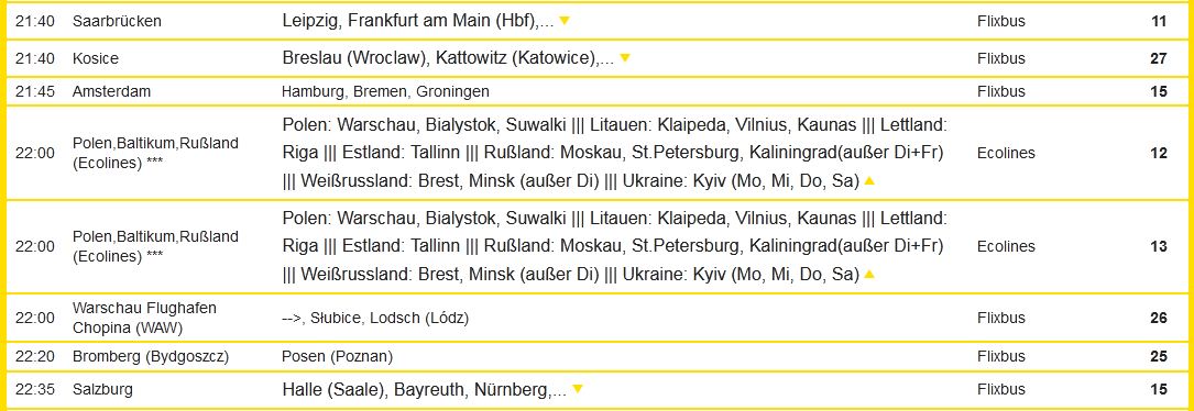 Codziennie inne opcje na tablicach odjazdów. Wszystkie kursy można sprawdzać na tablicy online https://zob.berlin/en/guests-visitors#abfahrten lecz dzień później już takiego połączenia nie było. Dzień następny, czyli czwartek 15.08 pojawia się kierunek: Polen,Baltikum,Rußland oferowany przez Ecolines Estonia OU, lecz trasa nieco zagmatwana a cała podróż z przesiadką (Riga (bus station), Latvia) ma trwać 33 h.