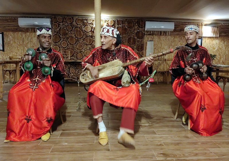 Wieczory to oczywiście Gnaoua, Marokański Folklor, Dekka Mrakchia. Wszystkie atrakcje odbywają się zawsze podczas kolacji. Jest także ognisko i kolejna porcja występów a na finał pokaz ogniomistrzów. To zawsze robi wrażenie i jest miłym akcentem na koniec dnia. Koniec aktywności programowych ale niekoniecznie koniec dnia, no bo jak iść spać w takich okolicznościach przyrody? Nie co dzień sypiam na pustyni, toteż nie oddałem się objęciom Morfeusza po ostatnich dźwiękach muzyki Tuaregów. Nad basenem życie toczy się praktycznie do rana.