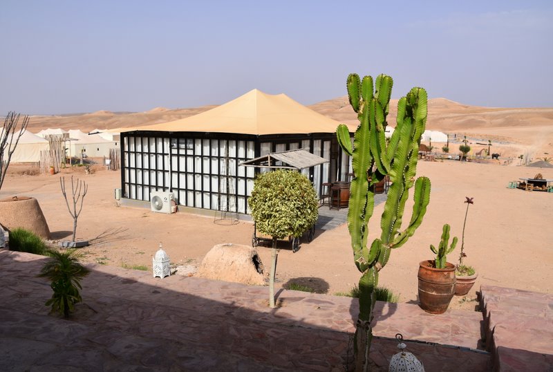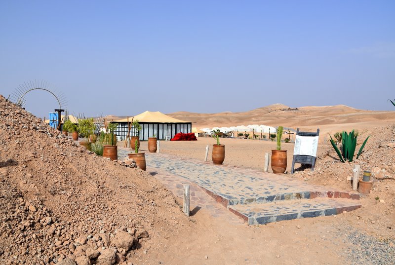 Obóz jakich wiele w tej części pustyni Agafay, znajduje się mniej więcej w połowie drogi z Marrakeszu w góry Atlasu Wysokiego. Odległość ok 30 km jest więc na tyle niewielka, by można było sobie pozwolić na jednodniowy wypad z Marrakeszu. To także całkiem ciekawa opcja dla wyruszających lub powracających z wyprawy na Tobkal, będącego najwyższym szczytem gór Atlasu, a dla wielu osób z całego świata, głównym celem wizyty w Maroko. Z obozu do samego szczytu w linii prostej jest zaledwie 50 km, więc przy dobrej pogodzie widać nie tylko masyw górski ale i wierzchołek Tubkala. Za masywem Atlasu zaczyna się wielka Sahara, największa pustynia na naszym globie.