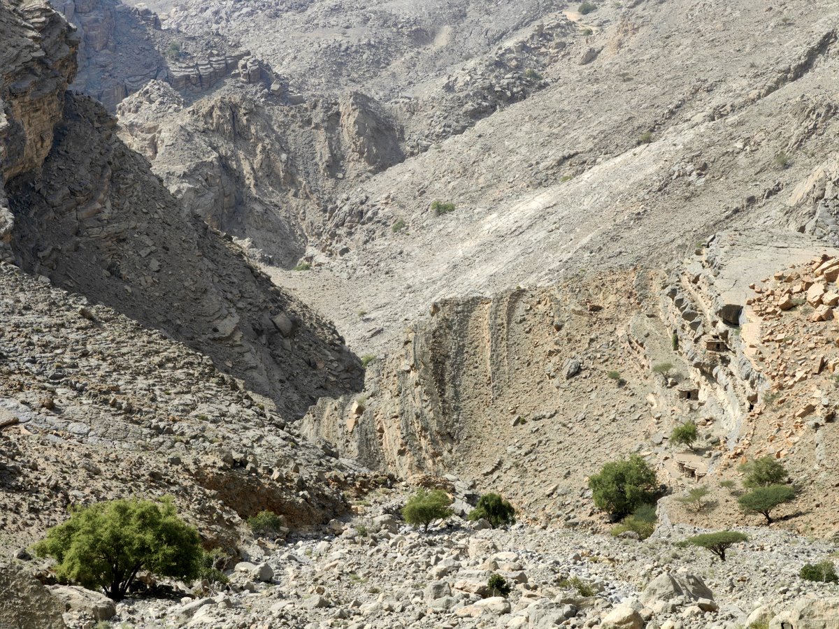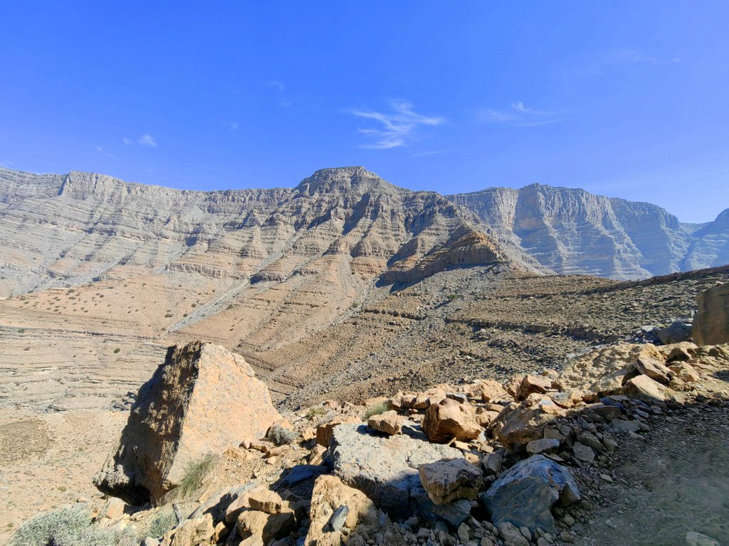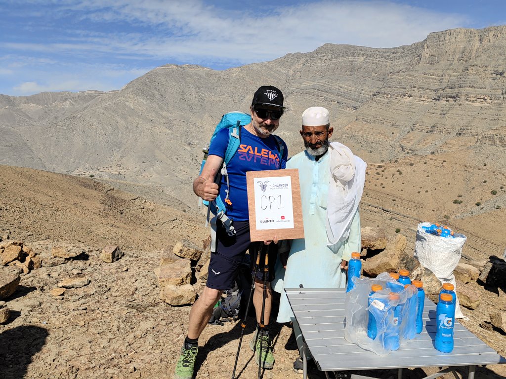Daleko nad nami widać wierzchołek Jebel Jais czyli najwyższej góry w Zjednoczonych Emiratach Arabskich. Tam także zaplanowany jest nasz pierwszy biwak i nocleg. Szlak którego nie widać, wije się pomiędzy skałami i warstwami rumoszu, przecinając urwiste zbocza grzbietu górskiego. Przede mną kilkugodzinna mozolna wędrówka przerywana postojami na odpoczynek i picie. Na jedzenie w tych warunkach nie mam absolutnie najmniejszej ochoty. słońce jest bezlitosne i mimo połowy listopada, temperatura sięga +32 stopni w cieniu a w słońcu jest nie do wytrzymania. Dookoła tylko skały. Krok za krokiem i tak mijają kolejne godziny. W końcu dochodzę do miejsca gdzie zbocze pokryte różnej wielkości skałami kończy się kilkaset metrów wyżej betonowym murkiem zakrętu drogi. Wysoko nade mną na skale widzę jakąś postać. Czuję ulgę bo to znak że jestem już prawie u celu. Celu dzisiejszego odcinka. Kolejne kroki i minuty podejścia resztkami sił i wreszcie słyszę okrzyki i oklaski. Tak witani byli wszyscy dochodzący do kolejnych punktów. Mam też drugą pieczątkę jaka jest konieczna do potwierdzenia przejścia całej trasy.