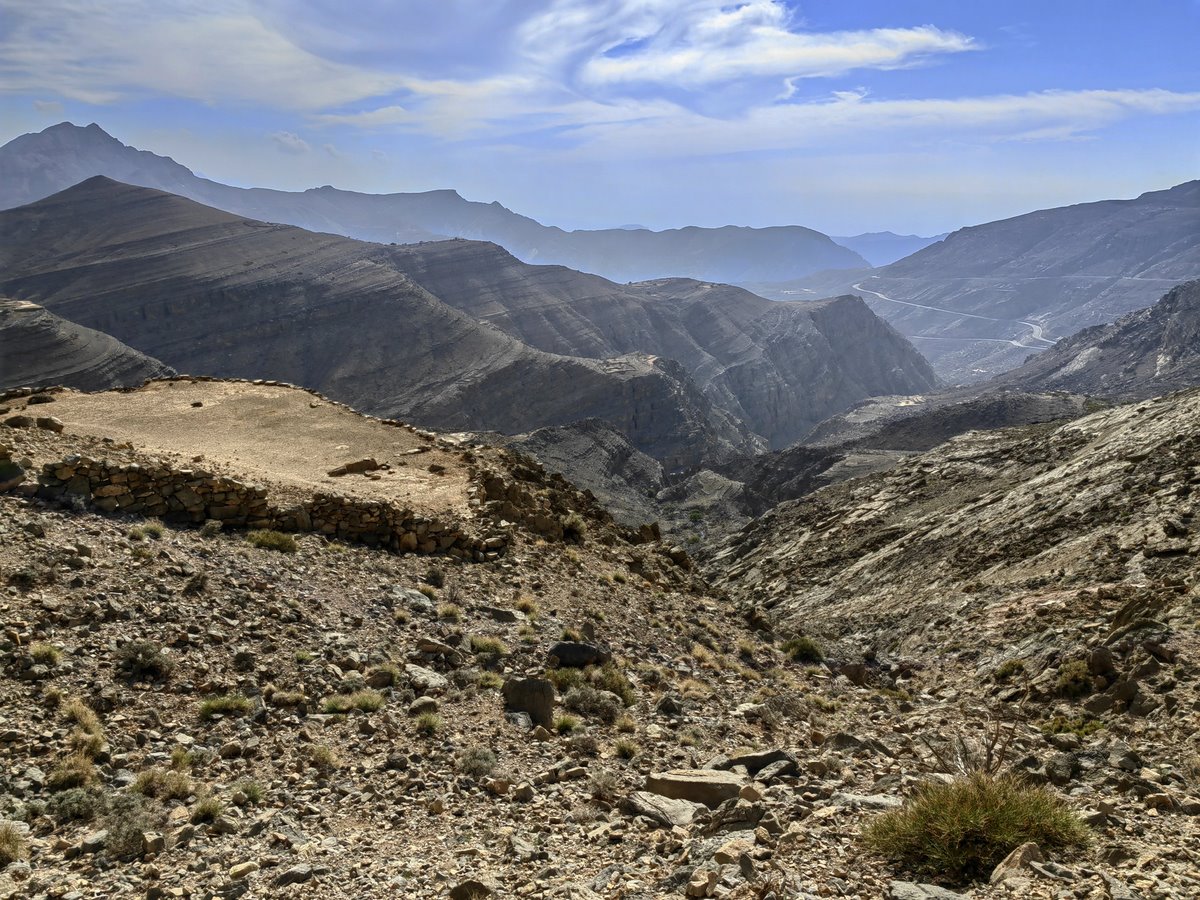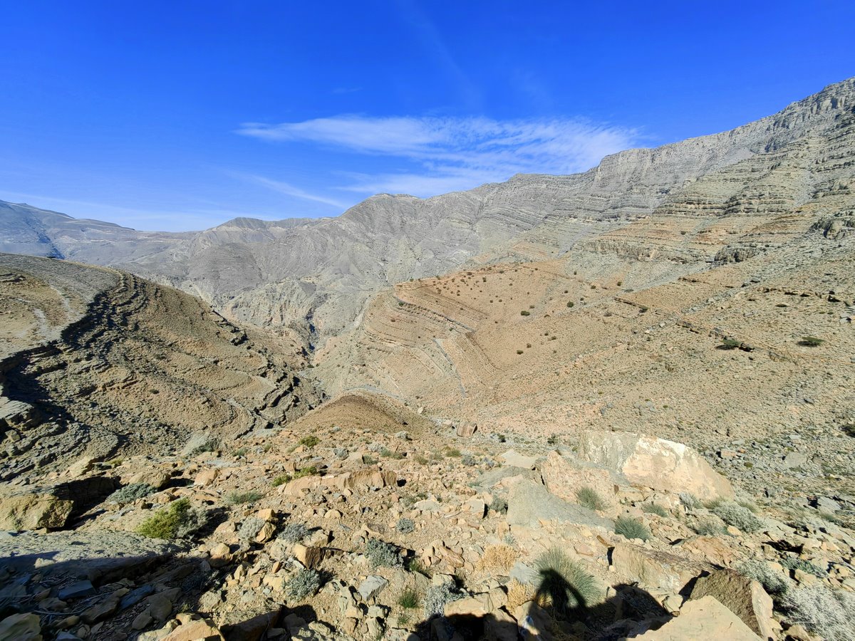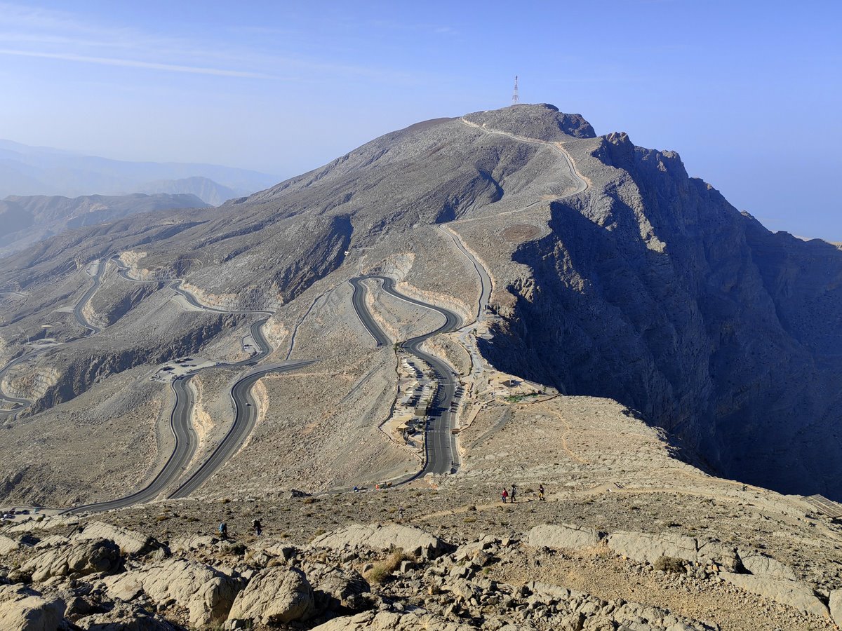 Skoro ruszałem z najwyższego punktu na całej trasie, wydawało mi się że dzisiejszy szlak prowadzi tylko w dół. Miałem rację, wydawało mi się ale o tym przekonałem się w w trakcie dnia. Nie powiem, początek marszu był bardzo przyjemny bo schodząc góry szlak prowadził grzbietem masywu a to pozwalało podziwiać zarówno potężny masyw górski z częścią Omanu po lewej, jaki i Zatokę Perską po prawej. Mijałem także miejsce które już znałem sprzed kilku dni oraz sprzed roku, gdzie miałem przyjemność zjechać na najdłuższej tyrolce na świecie (dwukrotnie) zjechałem nowo wybudowanym torem saneczkowym Jais Sledder oraz zjadłem pyszny obiad w najwyżej położonej restauracji w ZEA, 1484 by Puro która działa od niespełna roku. To było a teraz mijałem te miejsca ze świadomością, że zamiast zjazdów ma marsz a zamiast wykwintnego obiadu mam czystą wodę i batony energetyczne. No cóż, sam chciałem. Kilka zdjęć, spojrzenie na miejsce tętniące życiem i ruszam dalej. Po drodze zdobyłem kolejny szczyt, przygotowany dla lokalsów niczym nasz Kasprowy. Kilkaset metrów poniżej była oczywiście restauracja a nieco dalej na murku kilka butli z wodą. Zdziwiło mnie to nieco, bo woda ustawiona była ewidentnie pod uczestników Highlandera czyli naszej imprezy. Niezbyt zainteresowany przeszedłem obok, nieświadomy swojego błędu.