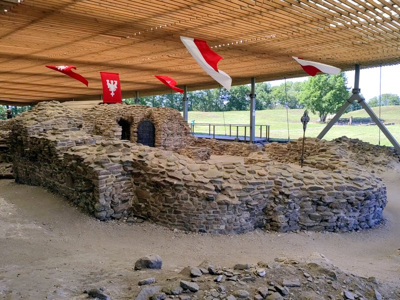 - Palatium z kaplicą – prawdopodobnie wzniesione przez Mieszka I, z unikatowym baptysterium, co sugeruje, że tutaj mógł odbyć się chrzest Polski w 966 roku.