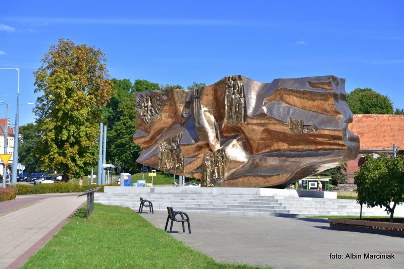 Największy złoty pomnik w Polsce czyli Pomnik Odrodzenia w Elblągu, znajduje się na placu Konstytucji.