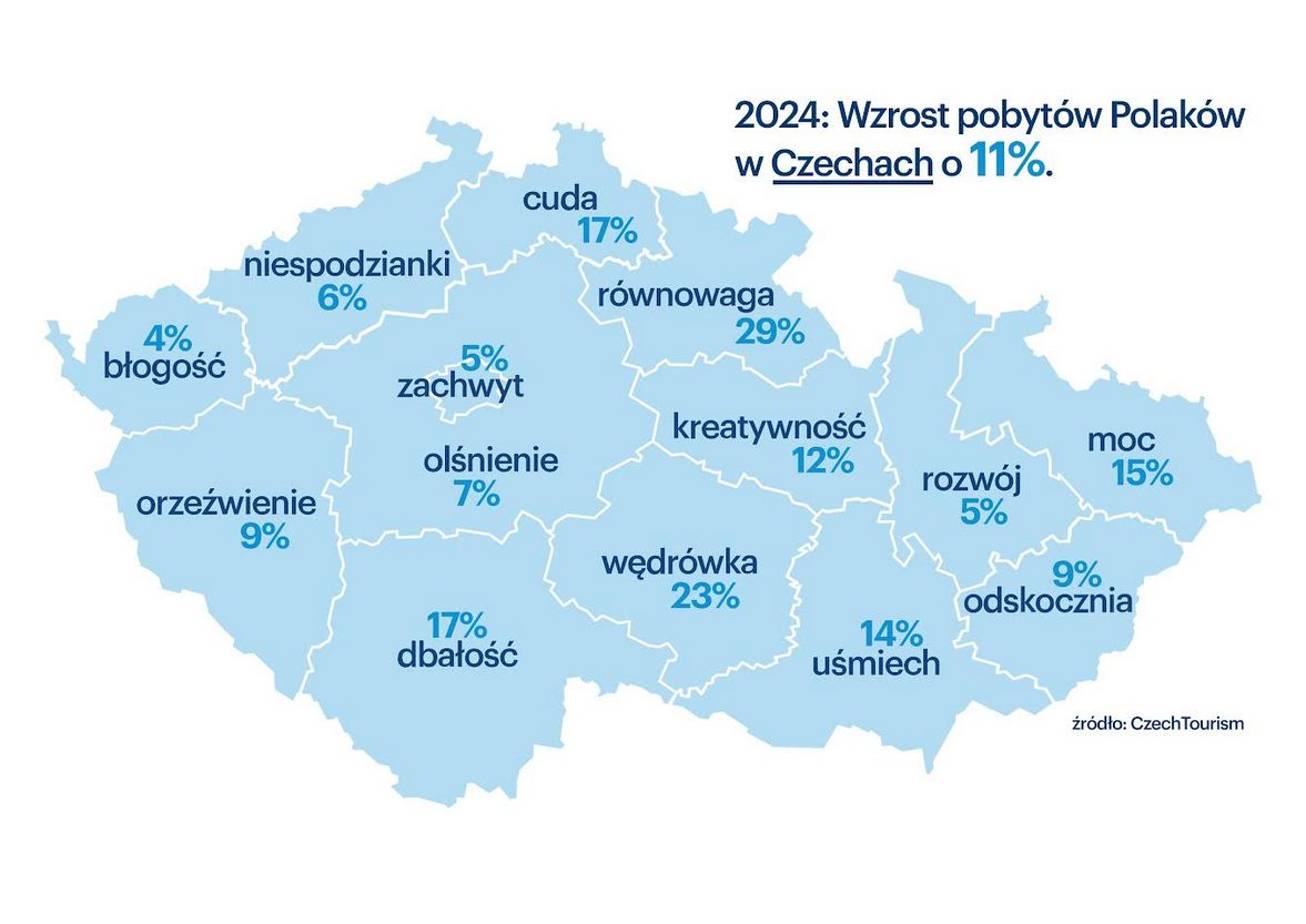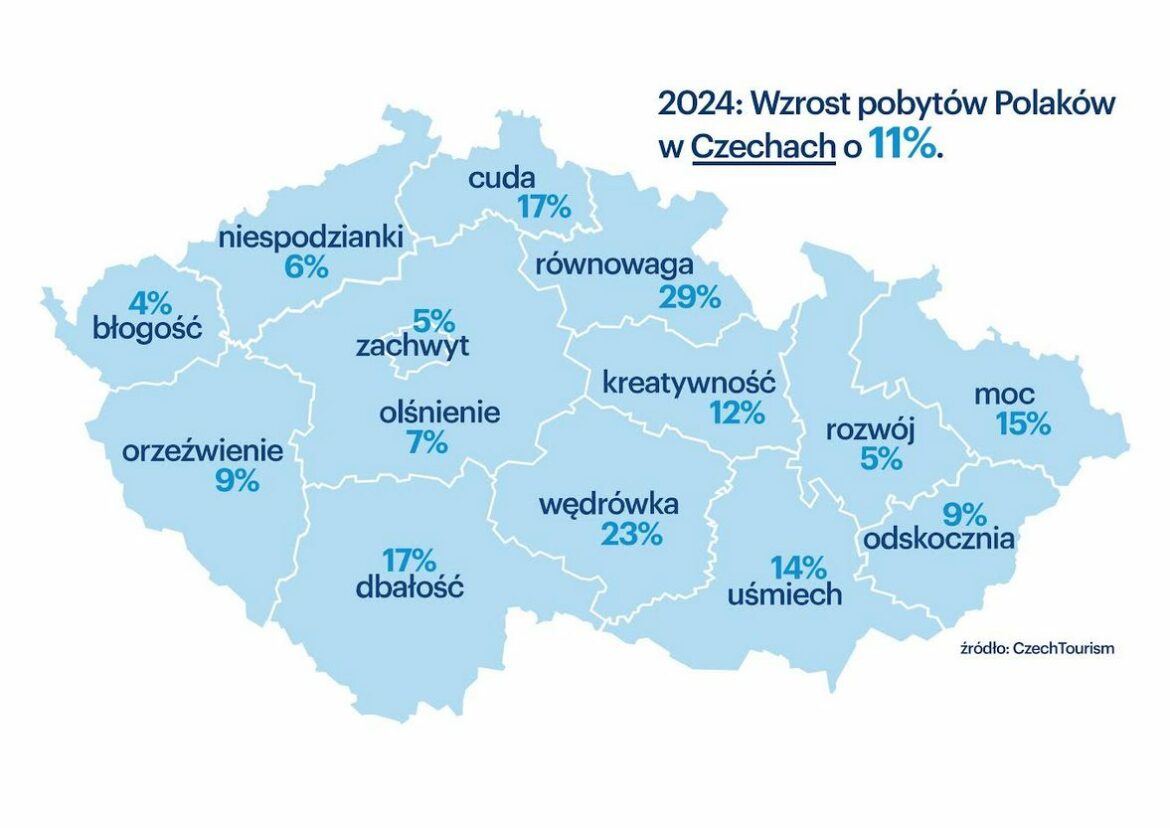 Największy wzrost zanotowano w kraju hradeckim, trzecim najpopularniejszym regionie wśród Polaków – liczba noclegów wzrosła tu aż o 29% (RÓWNOWAGA: Karkonosze, Czeski Raj, Broumov). Na Wysoczynie, na południowo-zachodnich Morawach, wzrost wyniósł 23% (WĘDRÓWKA: Telcz, Třebíč, Jihlava), a w Południowych Czechach 17% (DBAŁOŚĆ: Czeski Krumlow, Budziejowice, Tabor).