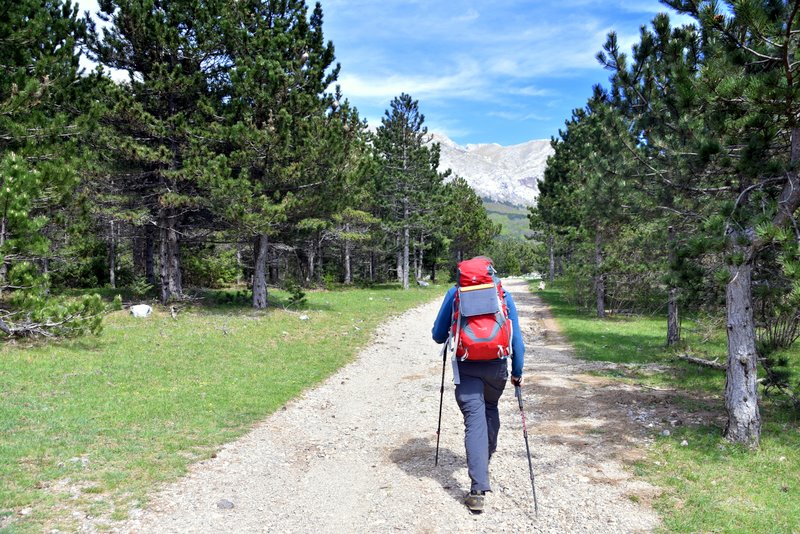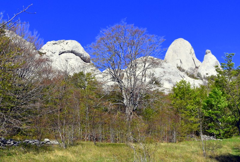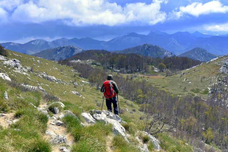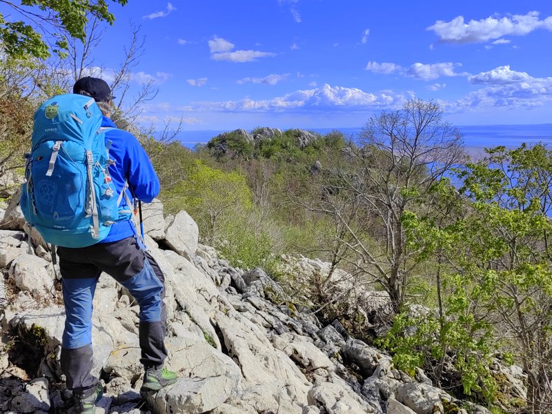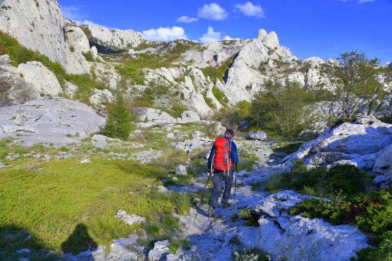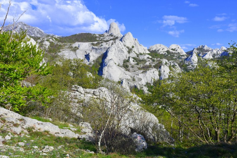 W końcu jest ten moment, moment startu w nieznane. Początkowo szlak wiedzie dobrze wydeptaną ścieżką, która dla „niedzielnych” turystów kończy się kilometr wyżej, z punktem widokowym na skalny masyw jaki zostawiamy w tyle. Kolejne minuty a dalej godziny, upływają na wędrówce szlakiem bardzo zróżnicowanym. Leśnym, wijącym się pomiędzy drzewami i skalnymi występami, polanami pomiędzy wzgórzami czy też zboczami ze skalnym rumoszem. Z takich miejsc widoki zmuszają do chwilowych postojów i oczywiście zdjęć. Są pierwsze ochy i achy, a to dopiero początek przygody w tej części Velebitu.