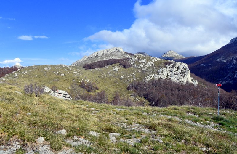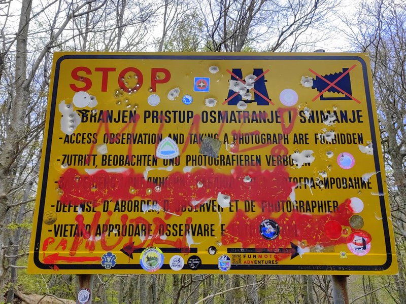 Tym razem na szlaku przewaga skał i zarośli przez które należy się przeciskać. Dla przypomnienia, nie jest to szlak którym codziennie wędrują tłumy. To szlak z dala od cywilizacji i wszelkich wygód. By z niego zejść do najbliższej miejscowości, należy przeznaczyć kilka godzin, najczęściej szlakiem którym w ciągu roku przejdzie więcej zwierząt nich ludzi. Nie bez przyczyny, kilka kilometrów dalej znajdują się ruiny dawnej bazy radarowej i wielopoziomowego schronu wykutego we wnętrzu góry. Do tego miejsca docieramy zupełnie przypadkiem, gdy po kilku godzinach wędrówki, dochodzimy do drogi leśnej, przy której stoi mocno ostrzelana tablica pamiętająca trudne czasy rozpadu Jugosławii.