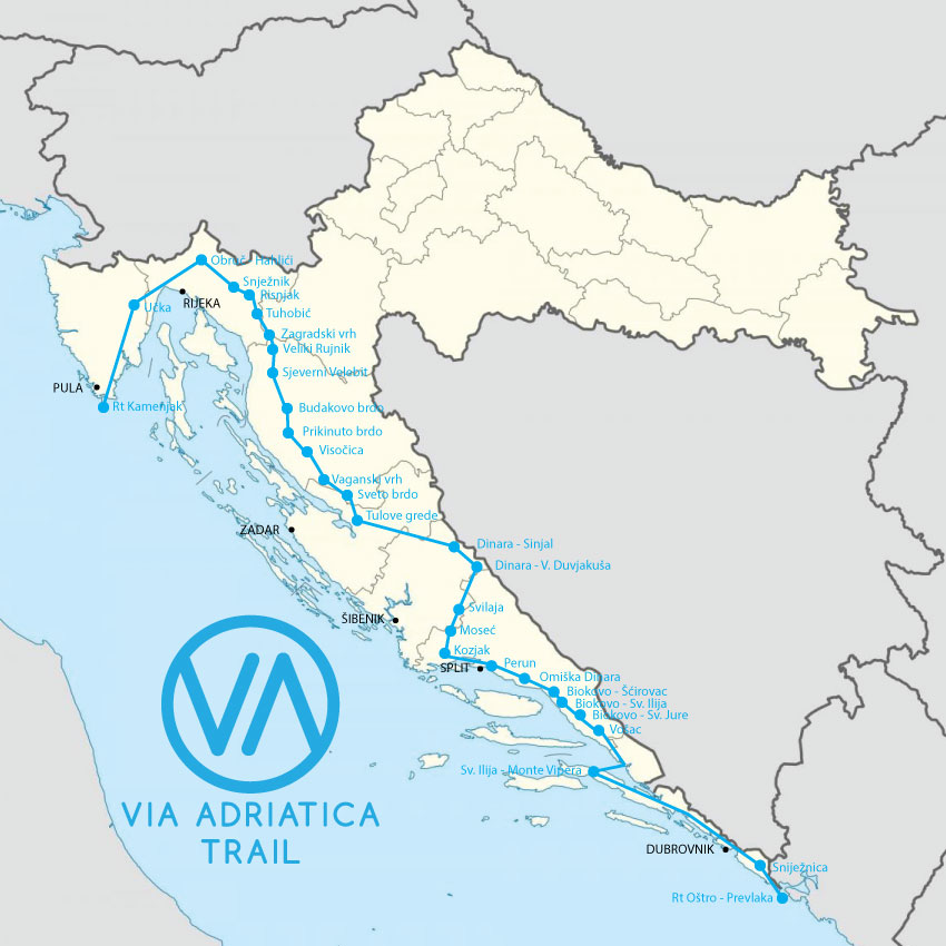 Szlak jaki opisany i pokazany jest poniżej, pokrywa się częściowo z Via Adriatica Trail – łącząc dwa najbardziej odległe punkty Chorwacji, 1100 km przeważnie górskiej wędrówki, 42 km podejść, ok 2 m-ce bardzo wymagającego marszu.