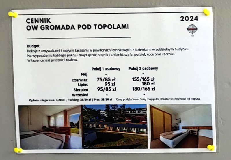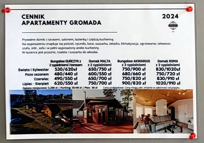 Podobnie jak w hotelach także i tym ośrodku jest wybór standardu. Wybór uzależniony od oczekiwań klientów, ale wiąże się to z nieco innymi cenami. Jednemu wystarczy nocleg za 75 zł a inny wybierze domek o podwyższonym standardzie 2x droższy (od osoby). Ceny są także uzależnione od miesiąca w jakim planujemy przyjazd nad Bałtyk. Oczywistym jest że w wysokim sezonie ceny są nieco wyższe od pozostałych miesięcy. Tak wygląda cennik za pokój z umywalką (węzeł sanitarny jest wspólny w każdym pawilonie).