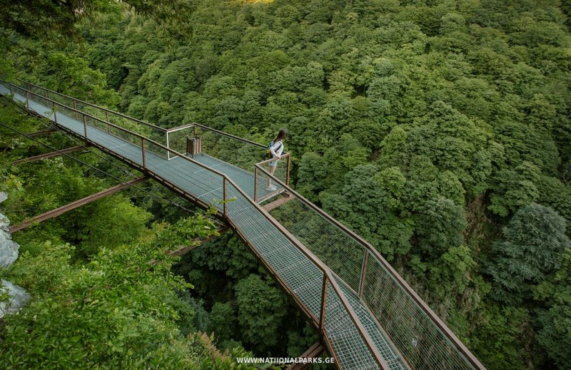 Jeśli kiedykolwiek marzyłeś o przechadzce zawieszonej w powietrzu – Okatse Canyon spełni Twoje oczekiwania z nawiązką. Kładka o długości 780 metrów prowadzi wzdłuż stromych skał, a miejscami… nad niczym innym, jak przepaścią głęboką na 100 metrów.