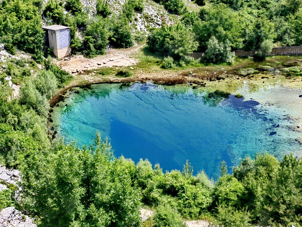 Będąc precyzyjnym to nie jedno i nie dwa a właściwie trzy źródła ma Cetna – Veliko Vrilo, Vokovića Vrilo oraz Batića Vrilo. Głównym i najważniejszym jest oczywiście błękitne jeziorko bez dna a właściwie to dotąd poznane, bo nurkom udało się zejść na głębokość 115 metrów. Taki efekt jest dla obserwatorów podziwiających ten fenomen z platformy widokowej zbudowanej na skarpie kilkanaście metrów powyżej lustra wody. Dodając do tego masyw Dinary zamykający kadr, widok jest przepiękny. Woda leniwie przetacza się płytkim strumieniem by połączyć się z inną odnogą rzeki mającej początek w Izvor Vuković (mniejsze źródło rzeki Cetina). W połowie odległości pomiędzy dwoma źródłami, znajduje się trzecie, szczelnie otoczone kępą drzew. To trzecie źródło znajduje się w odległości ok. 200 m na zachód od kościoła Świętego Zbawienia. Kościół jest wyjątkowym zabytkiem i to miejsce także warto odwiedzić. Tak połączona Cetina meandrując przez pola, wpływa do jeziora Peruča. Ja jednak obrałem inny kierunek i udałem się kilkanaście kilometrów dalej do źródła rzeki Krka.