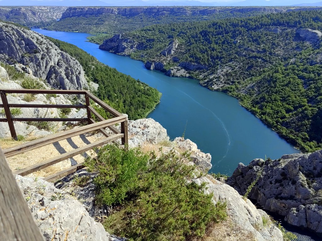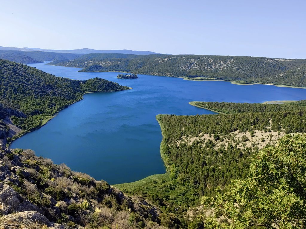 Z tego miejsca doskonale widać wyspę Visovač z jednej a wodospad Roški Slap z drugiej strony jeziora.