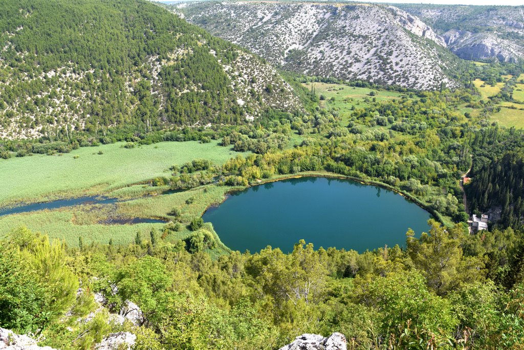 Samolot powrotny mam dopiero na następny dzień i to późno wieczorem. Mam zatem jeszcze sporo czasu a siedzieć w miejscu nie potrafię. Szybka decyzja i obieram kierunek na Vidikovac Krnići Gornji. Kilka kilometrów marszu lub kilkanaście km jazdy samochodem dzieli od mostu do punktu widokowego na dopływ rzeki Čikola do rzeki Krka. Čikola ma swoje źródło a właściwie początek jakim jest jezioro Toraka. Niemal idealne koło o średnicy 200 metrów otoczone wzgórzami, oglądane ze specjalnie przygotowanego punktu widokowego i miejscem do odpoczynku.