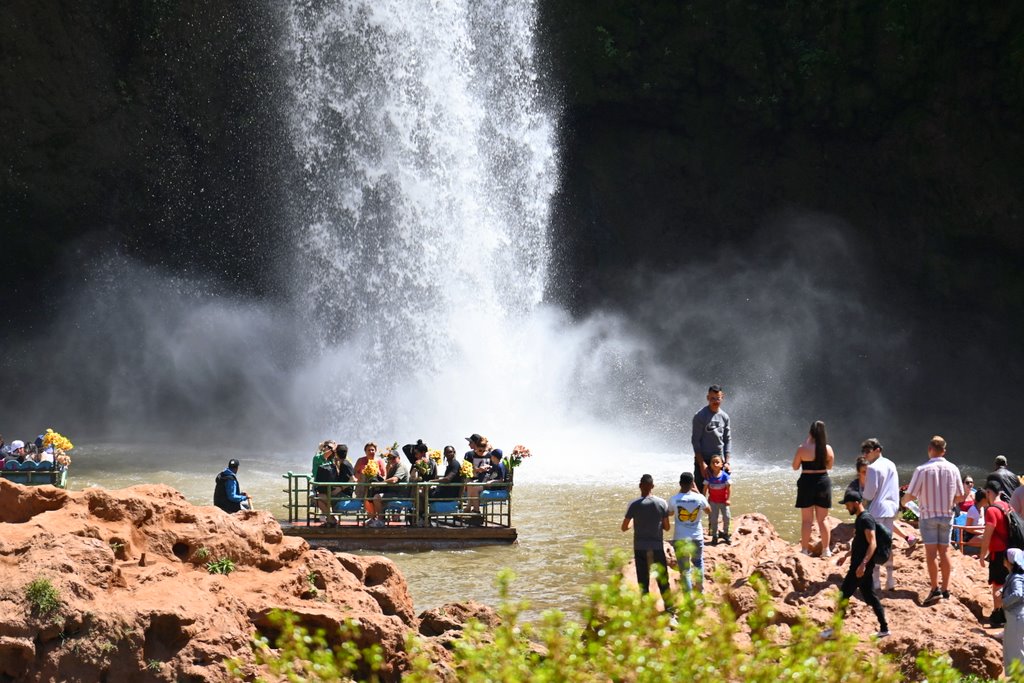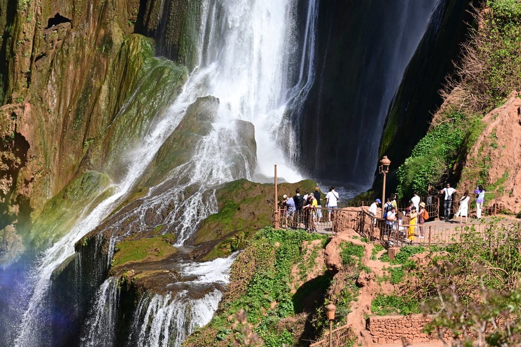 Po ok 40 minutach wędrówki, licząc od wyjścia z autokaru i przejścia górnej części, dochodzimy do rozlewiska z opadających mas wody z wodospadu znajdującego się ok 100 m dalej. Czas na kolejne dziesiątki zdjęć i podziwianie majestatu wodospadu. Można ten majestat podziwiać z bardzo bliska, z chłodzącą bryzą na twarzy. Bywa że i niezłego schłodzenia, gdy wiatr mocniej zawiruje opadającą wodą. Te atrakcje można poczuć za jedyne 20 dirhamów, bo tyle kosztuje kilkunastominutowa przejażdżka tratwami podpływającymi pod sam huczący wodospad. Z tej odległości opadająca masa wody robi duże wrażenie a mimo palącego słońca mocno schładza.