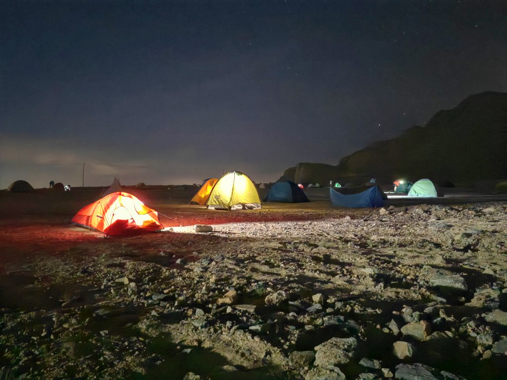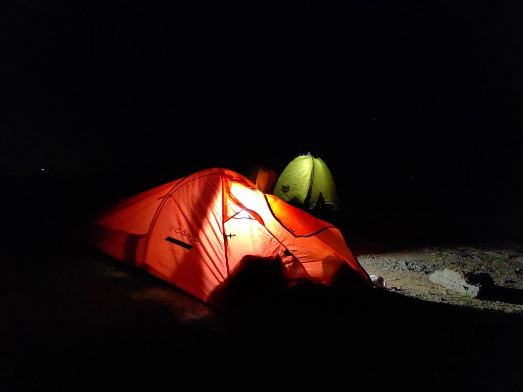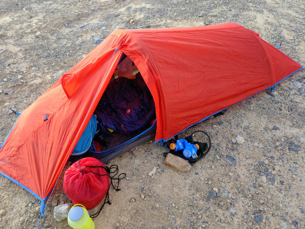 Pierwsze rozbicie namiotu miało miejsce na biwaku na najwyższej górze Al-Hadżar w Zjednoczonych Emiratach Arabskich. Pierwsze, bez wcześniejszych prób w domu i od razu przy niezłym wietrze. Do tego na twardym gruncie bez możliwości wbicia szpilek. Na rozbicie pozwoliła ciekawa konstrukcja z dwoma poprzecznymi łukowymi pałąkami i linkami – odciągami, które zablokowałem kamieniami. Druga noc i biwak na innym podłożu, gdzie już mogłem bez problemów wbijać szpilki.
