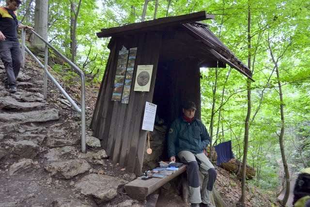 Wracamy do rozwidlenia i podążamy jeszcze kilka minut szlakiem czerwonym wzdłuż Dunajca, mijając po drodze Piec Majki (niewielka grota pod przewieszoną skałą) oraz pawilon Pienińskiego Parku Narodowego (granica obszaru chronionego)