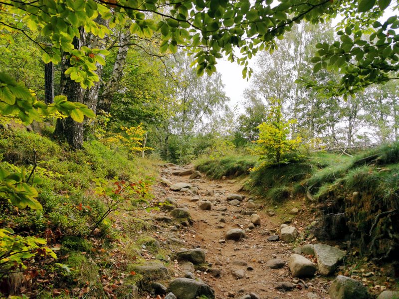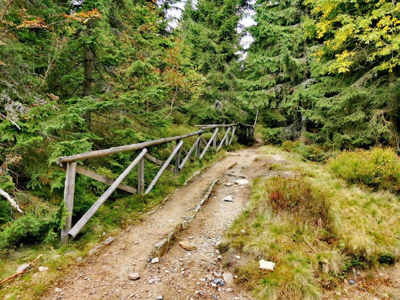 Za Karpaczem szlak wiedzie przez doliny Karkonoszy, najwyższego pasma Sudetów, objętego ochroną w ramach Karkonoskiego Parku Narodowego. To kraina wodospadów, torfowisk i rozległych panoram, gdzie przyroda wciąż zachowała swój dziki charakter. Na szlaku często towarzyszy tylko szum wiatru i zapach świerków. Często spoglądam na grzbiet pasma górskiego ze Śnieżką w roli głównej, po którym wiedzie Główny Szlak Sudecki. Tam, zarówno na szlaku jak i w wielu schroniskach może być spory ruch i gwar, którego nie mam na szlaku jakim podążam. Mam za to zapach lasu, śpiew ptaków i szum wody, a to najlepsza muzyka dla tych, którzy szukają autentycznego odpoczynku.